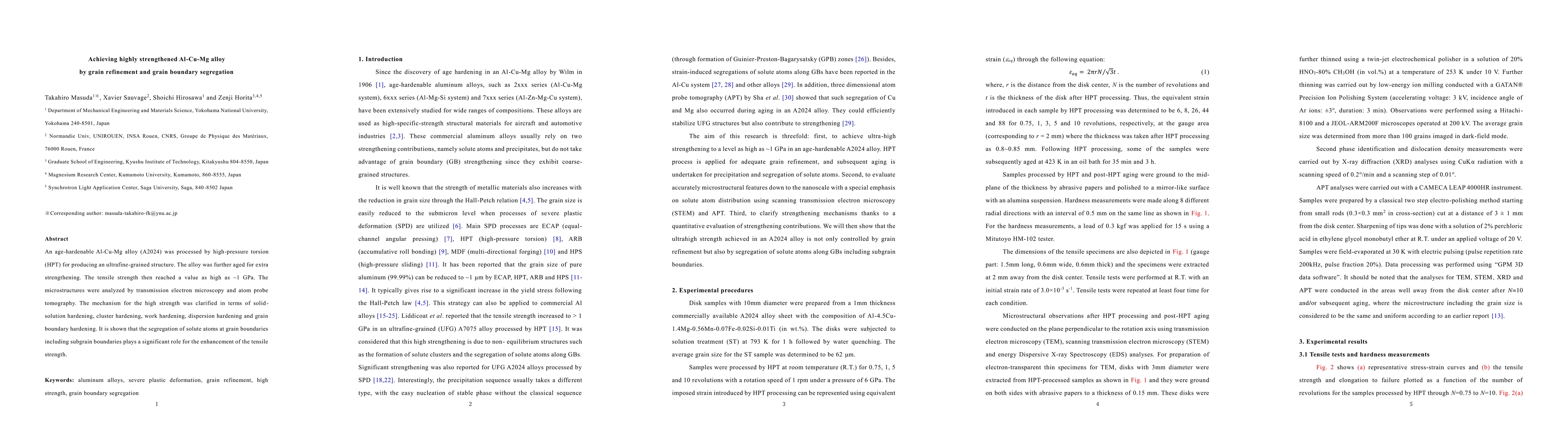 This study processed A2024 Al-Cu-Mg alloy via high-pressure torsion to achieve an ultrafine-grained structure, followed by aging for additional strengthening, resulting in a tensile strength of ~1 GPa. The enhanced strength is attributed to multiple mechanisms including solid-solution, cluster, work, dispersion, and grain boundary hardening, with significant solute atom segregation at grain boundaries.