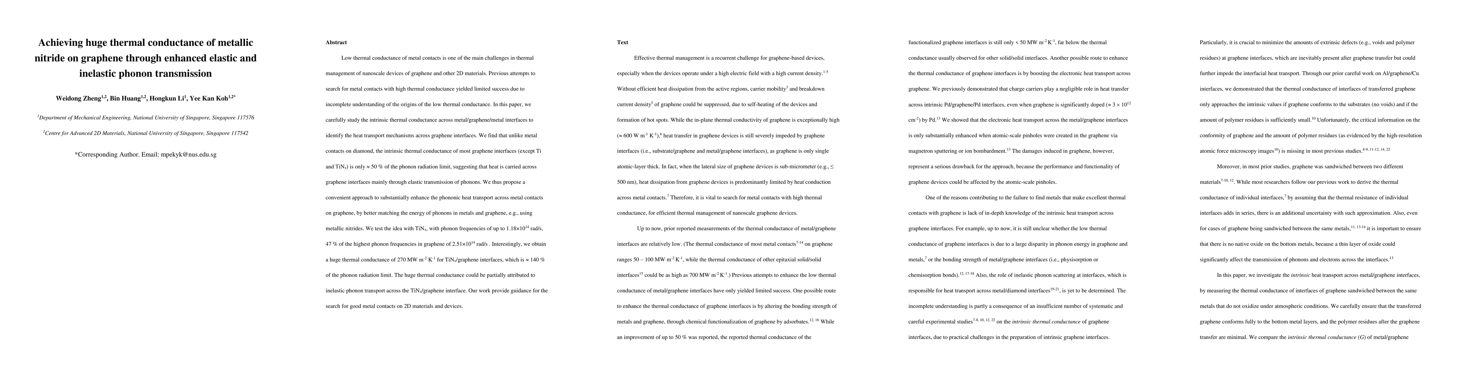 Low thermal conductance of metal contacts is one of the main challenges in thermal management of nanoscale devices of graphene and other 2D materials. Previous attempts to search for metal contacts with high thermal conductance yielded limited success due to incomplete understanding of the origins of the low thermal conductance. In this paper, we carefully study the intrinsic thermal conductance across metal/graphene/metal interfaces to identify the heat transport mechanisms across graphene interfaces. We find that unlike metal contacts on diamond, the intrinsic thermal conductance of most graphene interfaces (except Ti and TiNx) is only about 50 % of the phonon radiation limit, suggesting that heat is carried across graphene interfaces mainly through elastic transmission of phonons. We thus propose a convenient approach to substantially enhance the phononic heat transport across metal contacts on graphene, by better matching the energy of phonons in metals and graphene, e.g., using metallic nitrides. We test the idea with TiNx, with phonon frequencies of up to 1.18*10^14 rad/s, 47 % of the highest phonon frequencies in graphene of 2.51*10^14 rad/s . Interestingly, we obtain a huge thermal conductance of 270 MW m-2 K-1 for TiNx/graphene interfaces, which is about 140 % of the phonon radiation limit. The huge thermal conductance could be partially attributed to inelastic phonon transport across the TiNx/graphene interface. Our work provides guidance for the search for good metal contacts on 2D materials and devices.