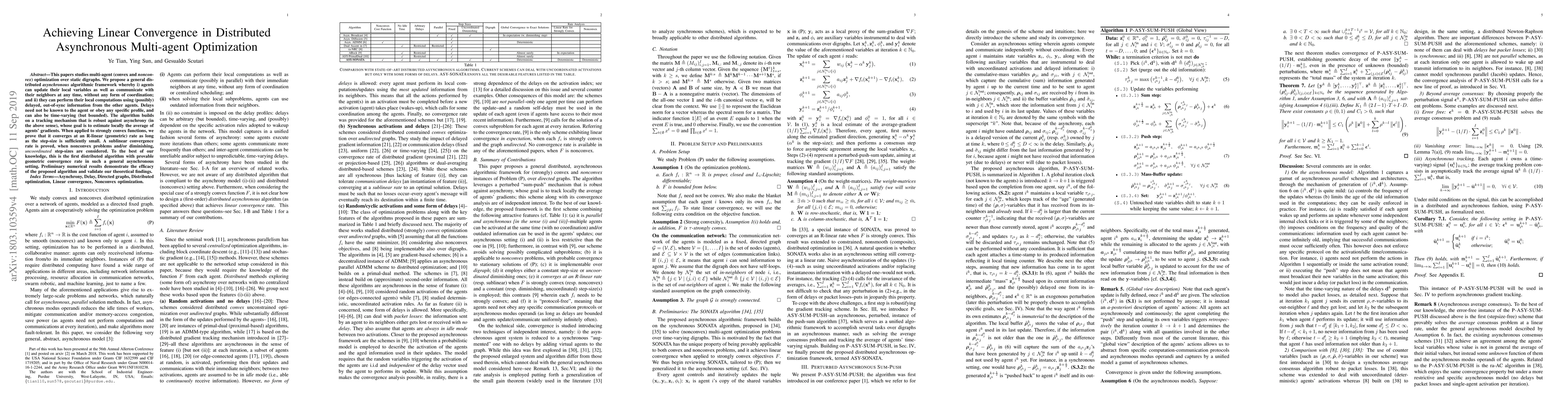 This papers studies multi-agent (convex and \emph{nonconvex}) optimization over static digraphs. We propose a general distributed \emph{asynchronous} algorithmic framework whereby i) agents can update their local variables as well as communicate with their neighbors at any time, without any form of coordination; and ii) they can perform their local computations using (possibly) delayed, out-of-sync information from the other agents. Delays need not be known to the agent or obey any specific profile, and can also be time-varying (but bounded). The algorithm builds on a tracking mechanism that is robust against asynchrony (in the above sense), whose goal is to estimate locally the average of agents' gradients. When applied to strongly convex functions, we prove that it converges at an R-linear (geometric) rate as long as the step-size is {sufficiently small}. A sublinear convergence rate is proved, when nonconvex problems and/or diminishing, {\it uncoordinated} step-sizes are considered. To the best of our knowledge, this is the first distributed algorithm with provable geometric convergence rate in such a general asynchronous setting. Preliminary numerical results demonstrate the efficacy of the proposed algorithm and validate our theoretical findings.