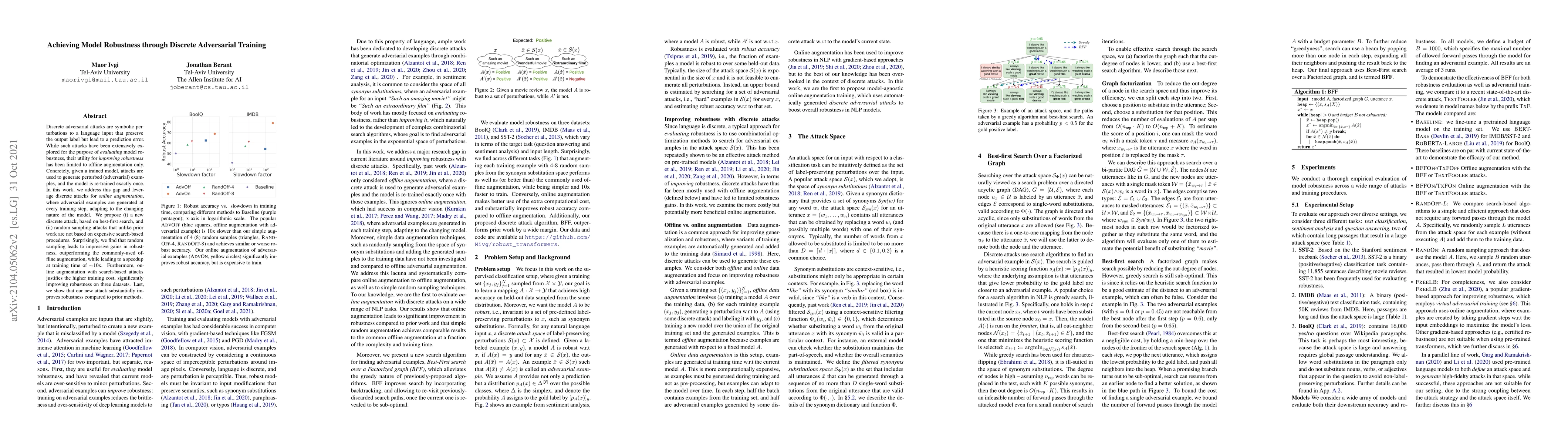 This paper proposes a new method for enhancing model robustness using discrete adversarial training through online augmentation, introducing a best-first search attack and random sampling techniques. The study finds that random sampling significantly boosts robustness while speeding up training by 10x, and search-based attacks further improve robustness despite higher training costs.