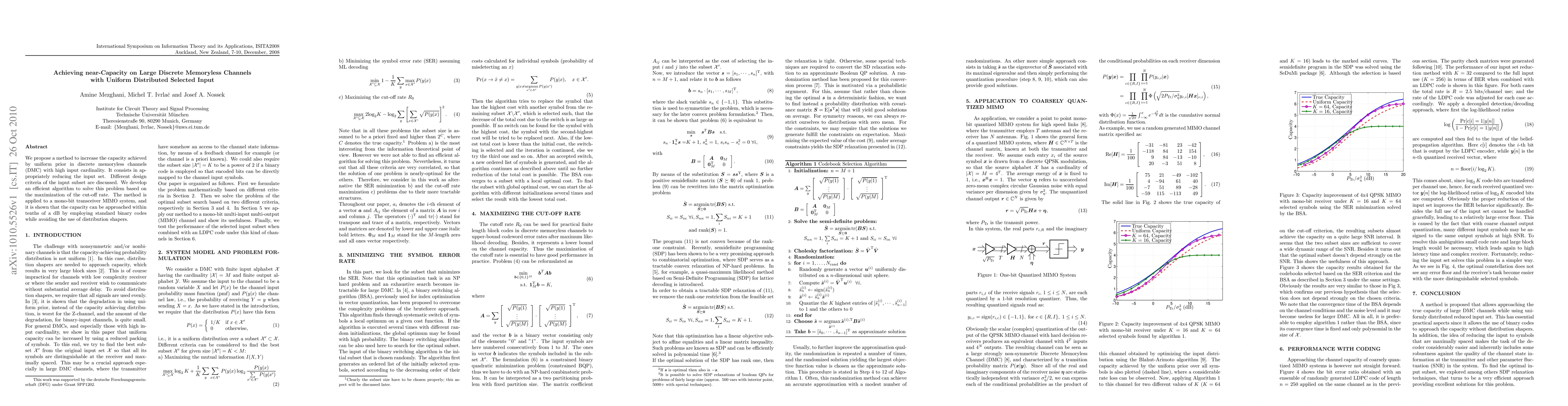 This paper proposes a method to enhance capacity in large discrete memoryless channels by reducing the input set, discussing various design criteria. An efficient algorithm based on maximizing the cut-off rate is developed, demonstrated to achieve near-capacity performance in a MIMO system with standard binary codes.