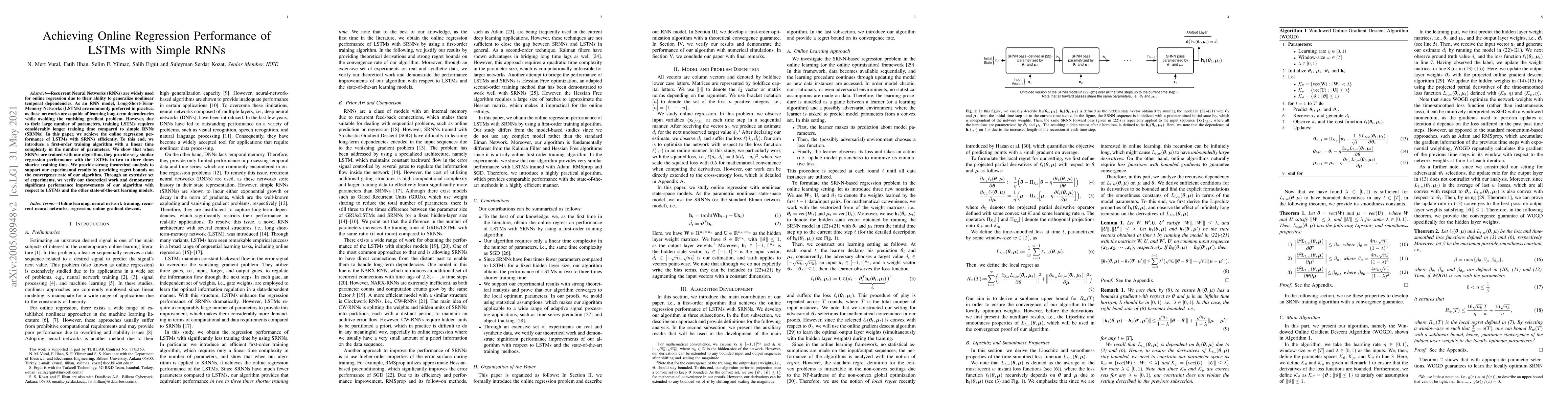 Recurrent Neural Networks (RNNs) are widely used for online regression due to their ability to generalize nonlinear temporal dependencies. As an RNN model, Long-Short-Term-Memory Networks (LSTMs) are commonly preferred in practice, as these networks are capable of learning long-term dependencies while avoiding the vanishing gradient problem. However, due to their large number of parameters, training LSTMs requires considerably longer training time compared to simple RNNs (SRNNs). In this paper, we achieve the online regression performance of LSTMs with SRNNs efficiently. To this end, we introduce a first-order training algorithm with a linear time complexity in the number of parameters. We show that when SRNNs are trained with our algorithm, they provide very similar regression performance with the LSTMs in two to three times shorter training time. We provide strong theoretical analysis to support our experimental results by providing regret bounds on the convergence rate of our algorithm. Through an extensive set of experiments, we verify our theoretical work and demonstrate significant performance improvements of our algorithm with respect to LSTMs and the other state-of-the-art learning models.