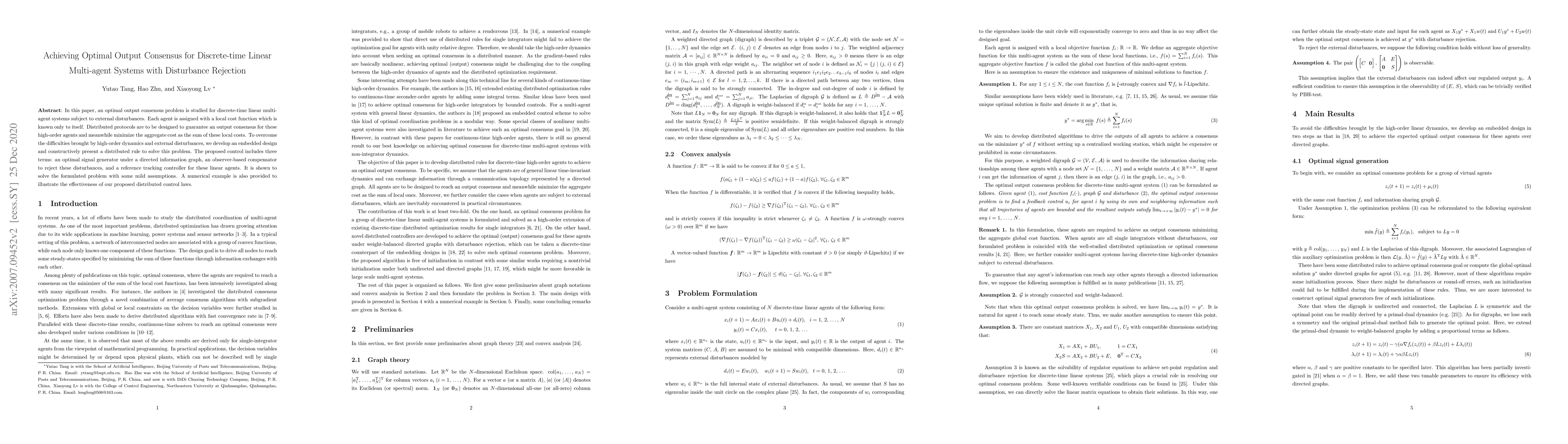 This paper addresses the optimal output consensus problem for discrete-time linear multi-agent systems under external disturbances. It proposes a distributed control protocol that combines an optimal signal generator, an observer-based compensator, and a reference tracking controller to achieve consensus while minimizing the aggregate local cost.