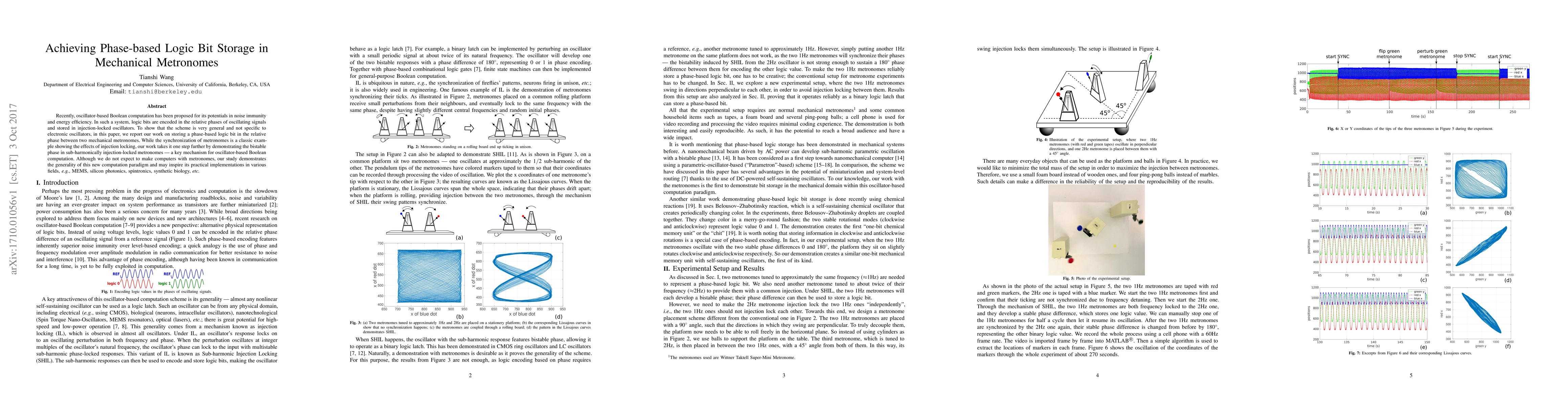 Recently, oscillator-based Boolean computation has been proposed for its potentials in noise immunity and energy efficiency. In such a system, logic bits are encoded in the relative phases of oscillating signals and stored in injection-locked oscillators. To show that the scheme is very general and not specific to electronic oscillators, in this paper, we report our work on storing a phase-based logic bit in the relative phase between two mechanical metronomes. While the synchronization of metronomes is a classic example showing the effects of injection locking, our work takes it one step further by demonstrating the bistable phase in sub-harmonically injection-locked metronomes --- a key mechanism for oscillator-based Boolean computation. Although we do not expect to make computers with metronomes, our study demonstrates the generality of this new computation paradigm and may inspire its practical implementations in various fields, eg, MEMS, silicon photonics, spintronics, synthetic biology, etc.