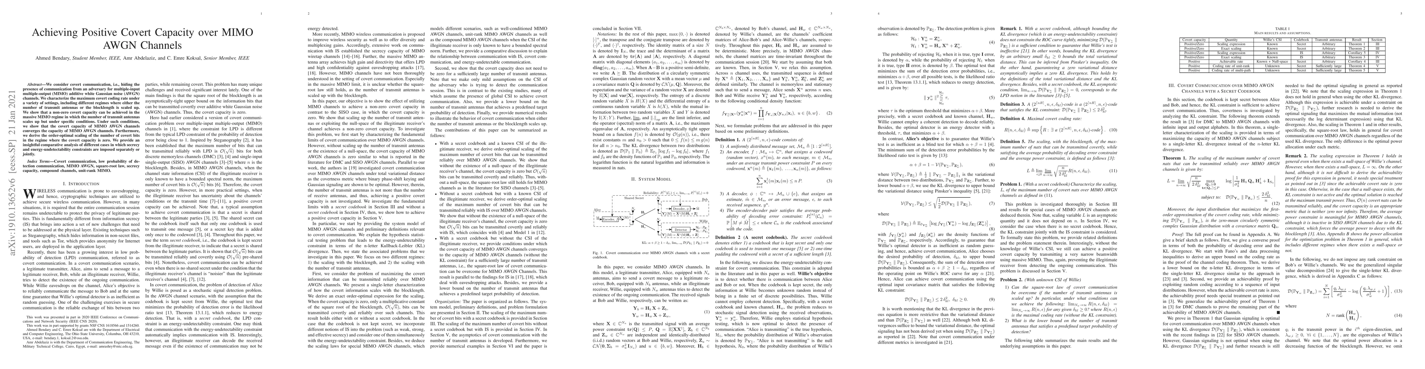 This paper explores covert communication over MIMO AWGN channels, demonstrating that a non-zero covert capacity can be achieved under massive MIMO conditions. It also analyzes the scaling of covert bits and provides a comparative analysis of secrecy and energy-undetectability constraints.