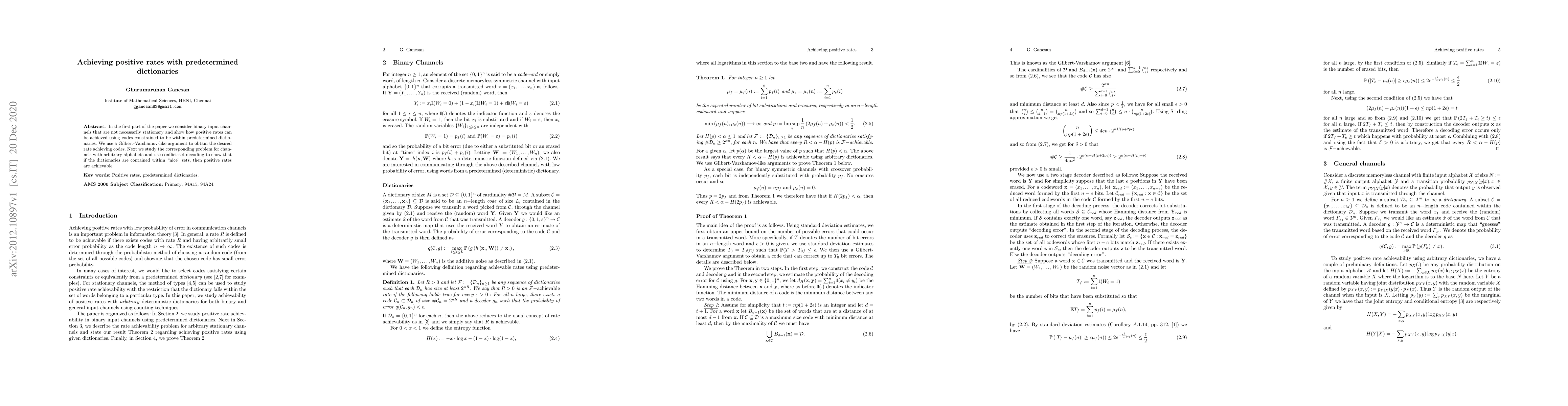 In the first part of the paper we consider binary input channels that are not necessarily stationary and show how positive rates can be achieved using codes constrained to be within predetermined dictionaries. We use a Gilbert-Varshamov-like argument to obtain the desired rate achieving codes. Next we study the corresponding problem for channels with arbitrary alphabets and use conflict-set decoding to show that if the dictionaries are contained within nice sets, then positive rates are achievable.
