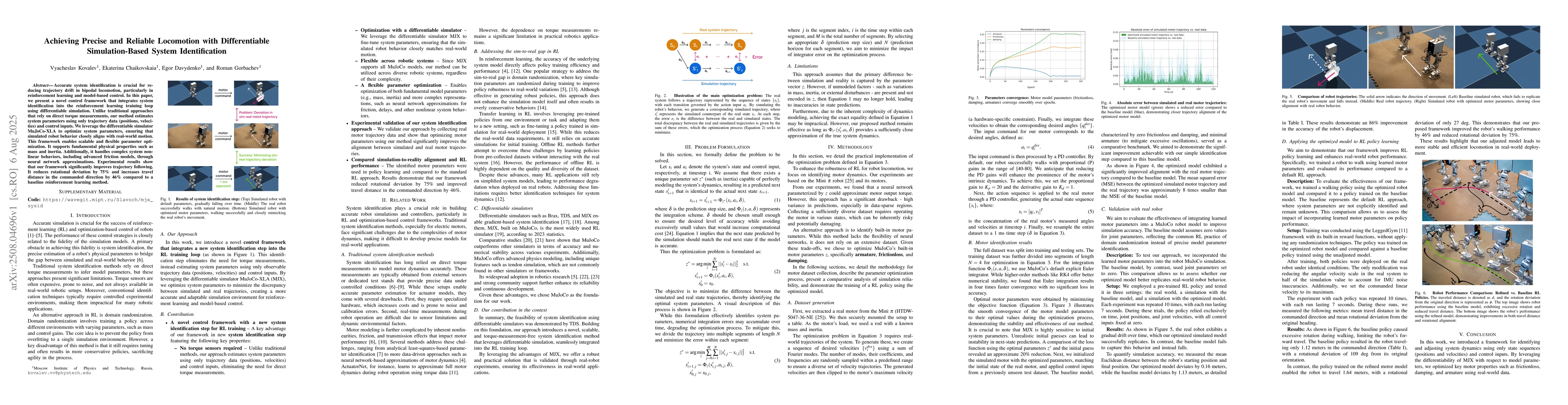 Accurate system identification is crucial for reducing trajectory drift in bipedal locomotion, particularly in reinforcement learning and model-based control. In this paper, we present a novel control framework that integrates system identification into the reinforcement learning training loop using differentiable simulation. Unlike traditional approaches that rely on direct torque measurements, our method estimates system parameters using only trajectory data (positions, velocities) and control inputs. We leverage the differentiable simulator MuJoCo-XLA to optimize system parameters, ensuring that simulated robot behavior closely aligns with real-world motion. This framework enables scalable and flexible parameter optimization. Accurate system identification is crucial for reducing trajectory drift in bipedal locomotion, particularly in reinforcement learning and model-based control. In this paper, we present a novel control framework that integrates system identification into the reinforcement learning training loop using differentiable simulation. Unlike traditional approaches that rely on direct torque measurements, our method estimates system parameters using only trajectory data (positions, velocities) and control inputs. We leverage the differentiable simulator MuJoCo-XLA to optimize system parameters, ensuring that simulated robot behavior closely aligns with real-world motion. This framework enables scalable and flexible parameter optimization. It supports fundamental physical properties such as mass and inertia. Additionally, it handles complex system nonlinear behaviors, including advanced friction models, through neural network approximations. Experimental results show that our framework significantly improves trajectory following.