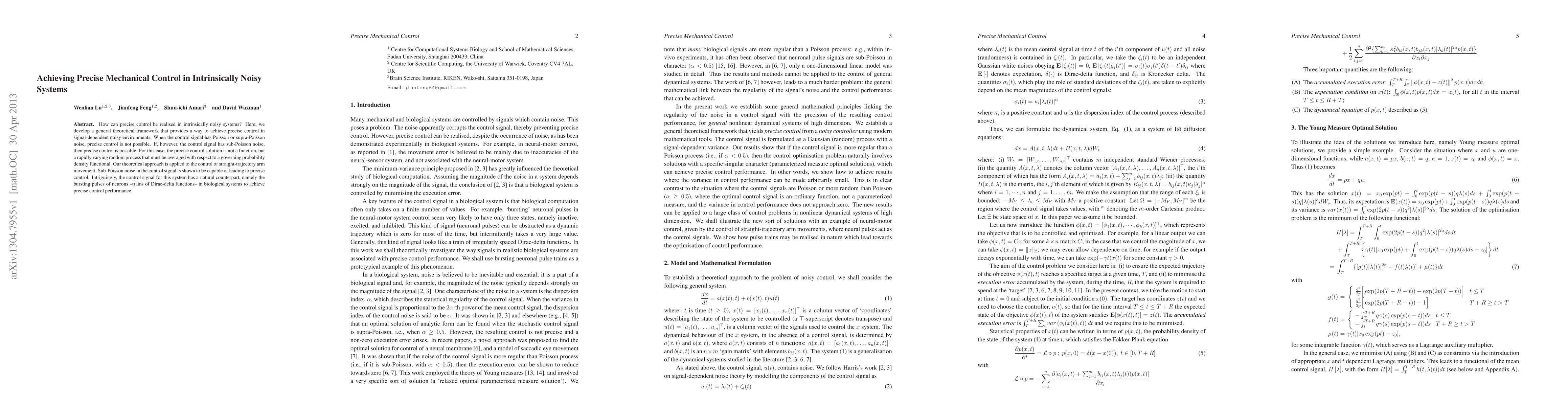 How can precise control be realised in intrinsically noisy systems? Here, we develop a general theoretical framework that provides a way to achieve precise control in signal-dependent noisy environments. When the control signal has Poisson or supra-Poisson noise, precise control is not possible. If, however, the control signal has sub-Poisson noise, then precise control is possible. For this case, the precise control solution is not a function, but a rapidly varying random process that must be averaged with respect to a governing probability density functional. Our theoretical approach is applied to the control of straight-trajectory arm movement. Sub-Poisson noise in the control signal is shown to be capable of leading to precise control. Intriguingly, the control signal for this system has a natural counterpart, namely the bursting pulses of neurons --trains of Dirac-delta functions-- in biological systems to achieve precise control performance.