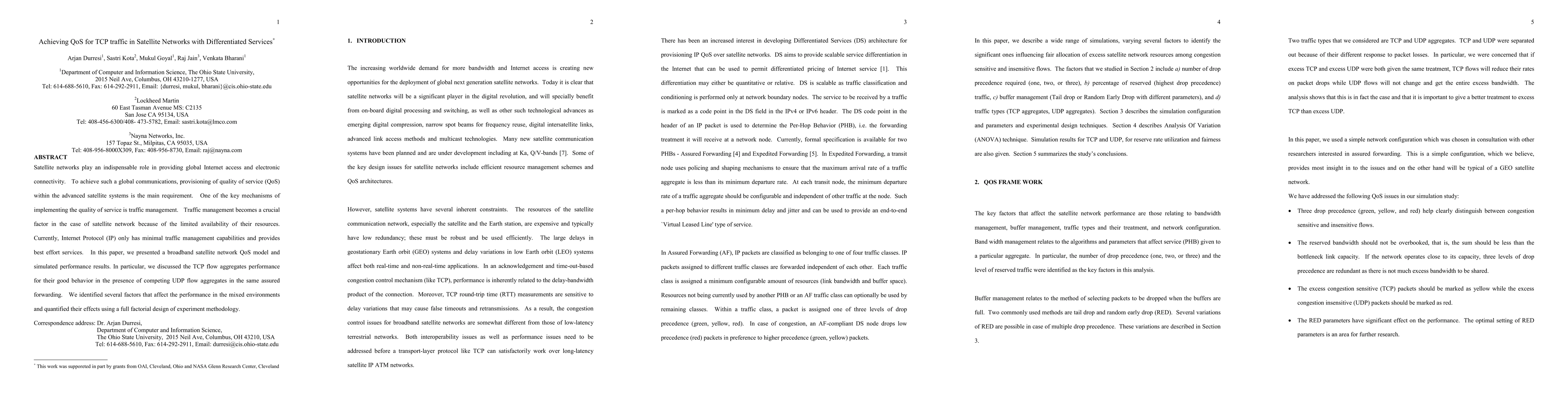 Satellite networks play an indispensable role in providing global Internet access and electronic connectivity. To achieve such a global communications, provisioning of quality of service (QoS) within the advanced satellite systems is the main requirement. One of the key mechanisms of implementing the quality of service is traffic management. Traffic management becomes a crucial factor in the case of satellite network because of the limited availability of their resources. Currently, Internet Protocol (IP) only has minimal traffic management capabilities and provides best effort services. In this paper, we present broadband satellite network QoS model and simulated performance results. In particular, we discuss the TCP flow aggregates performance for their good behavior in the presence of competing UDP flow aggregates in the same assured forwarding. We identify several factors that affect the performance in the mixed environments and quantify their effects using a full factorial design of experiment methodology.