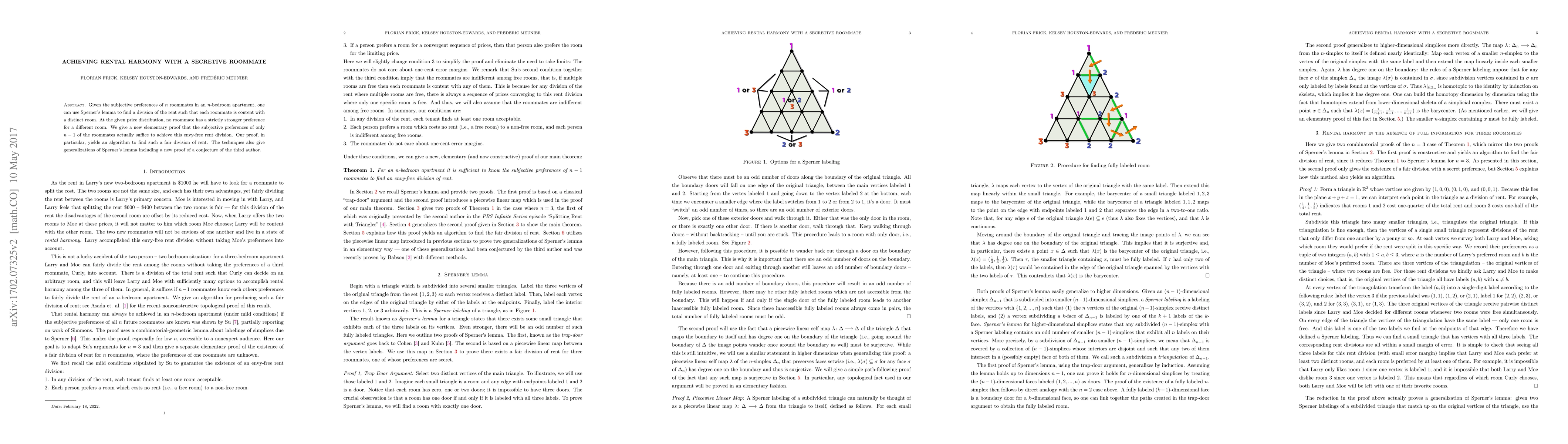 This paper explores an envy-free rent division method for n roommates using Sperner's lemma, proving that only n-1 roommates' preferences are necessary for achieving harmony. It presents an algorithm for fair rent distribution and extends Sperner's lemma with a new proof for a related conjecture.