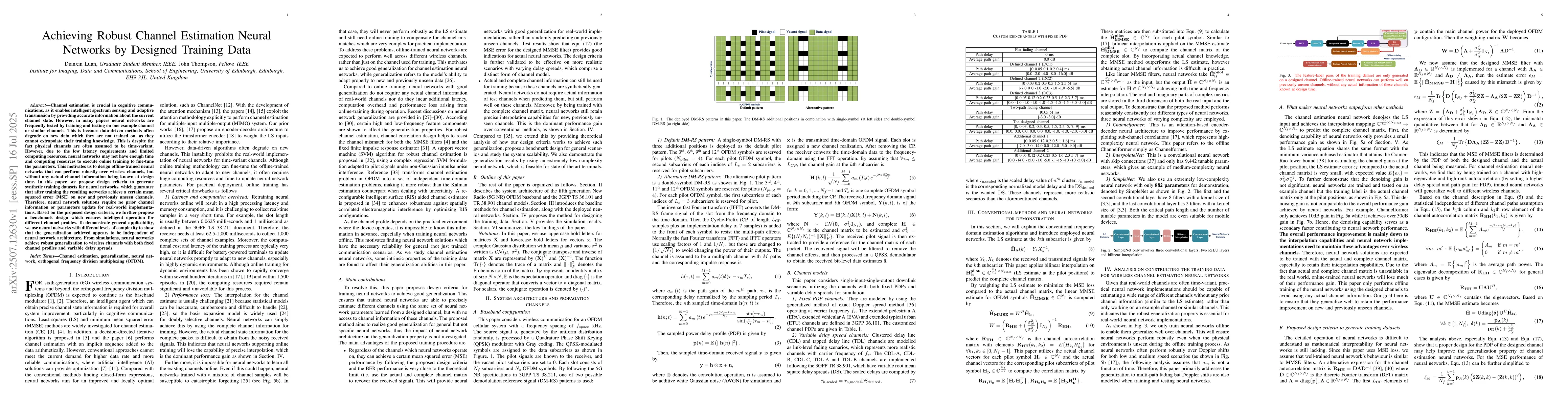 Channel estimation is crucial in cognitive communications, as it enables intelligent spectrum sensing and adaptive transmission by providing accurate information about the current channel state. However, in many papers neural networks are frequently tested by training and testing on one example channel or similar channels. This is because data-driven methods often degrade on new data which they are not trained on, as they cannot extrapolate their training knowledge. This is despite the fact physical channels are often assumed to be time-variant. However, due to the low latency requirements and limited computing resources, neural networks may not have enough time and computing resources to execute online training to fine-tune the parameters. This motivates us to design offline-trained neural networks that can perform robustly over wireless channels, but without any actual channel information being known at design time. In this paper, we propose design criteria to generate synthetic training datasets for neural networks, which guarantee that after training the resulting networks achieve a certain mean squared error (MSE) on new and previously unseen channels. Therefore, neural network solutions require no prior channel information or parameters update for real-world implementations. Based on the proposed design criteria, we further propose a benchmark design which ensures intelligent operation for different channel profiles. To demonstrate general applicability, we use neural networks with different levels of complexity to show that the generalization achieved appears to be independent of neural network architecture. From simulations, neural networks achieve robust generalization to wireless channels with both fixed channel profiles and variable delay spreads.