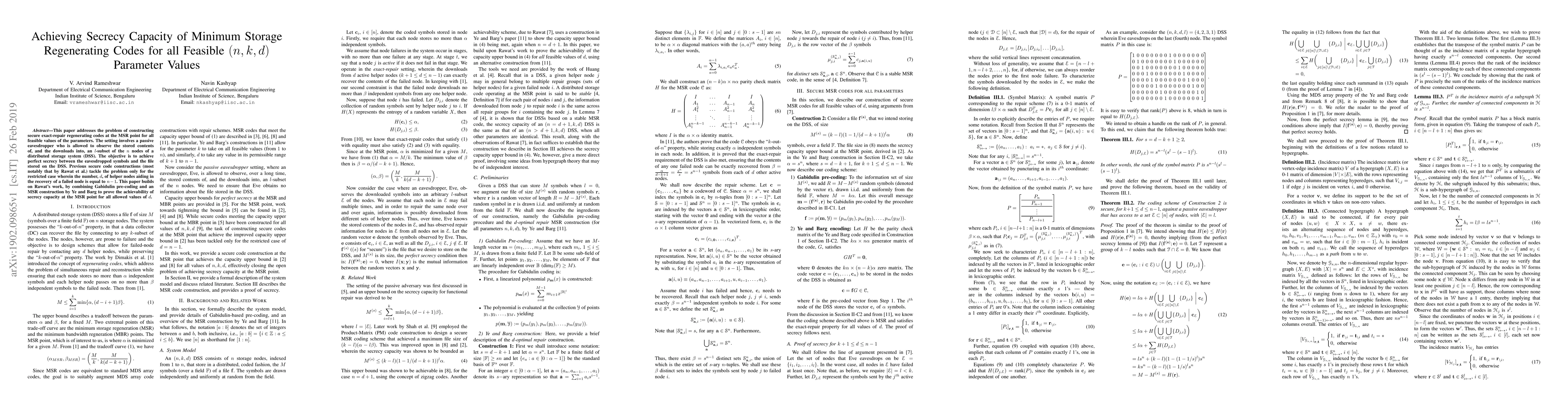 This paper constructs secure exact-repair regenerating codes achieving secrecy capacity for all feasible $(n, k, d)$ parameters, addressing a passive eavesdropper in a distributed storage system. It extends previous work by proving achievability for all $d$ values, not just $n-1$, using Gabidulin pre-coding and Ye-Barg MSR construction.