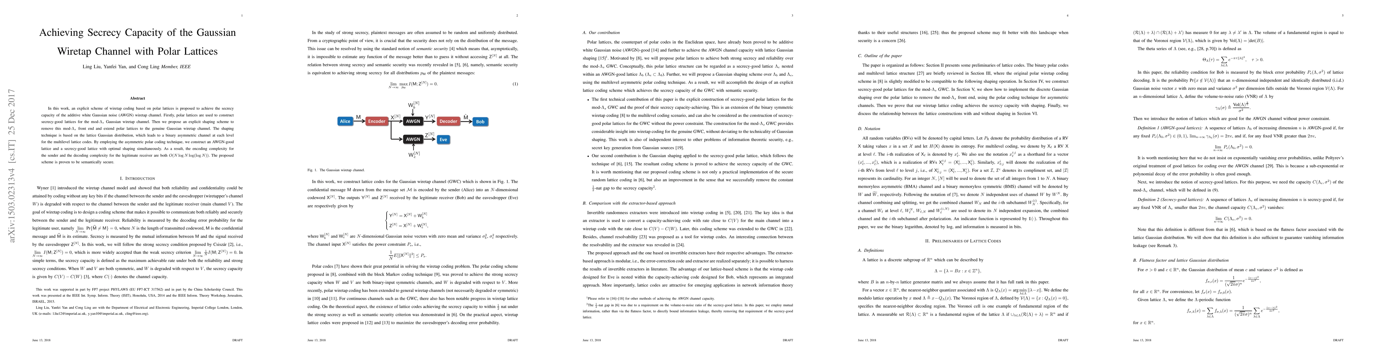 The explicit construction of wiretap coding schemes using polar lattices and the extension to the genuine Gaussian wiretap channel through a shaping technique based on lattice Gaussian distribution.
