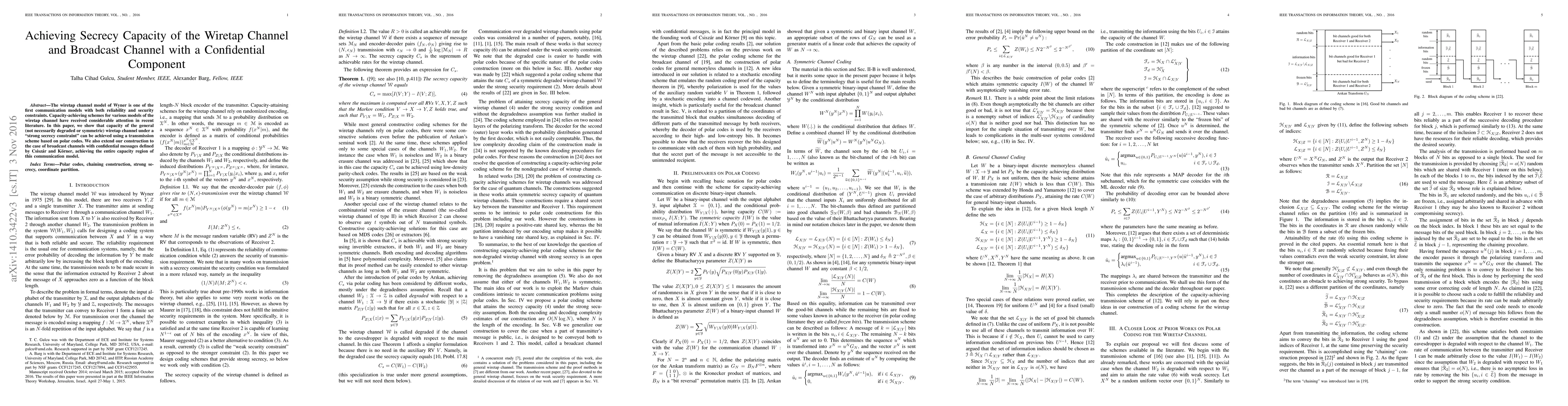 The wiretap channel model of Wyner is one of the first communication models with both reliability and security constraints. Capacity-achieving schemes for various models of the wiretap channel have received considerable attention in recent literature. In this paper, we show that capacity of the general (not necessarily degraded or symmetric) wiretap channel under a "strong secrecy constraint" can be achieved using a transmission scheme based on polar codes. We also extend our construction to the case of broadcast channels with confidential messages defined by Csisz{\'a}r and K{\"orner}, achieving the entire capacity region of this communication model.