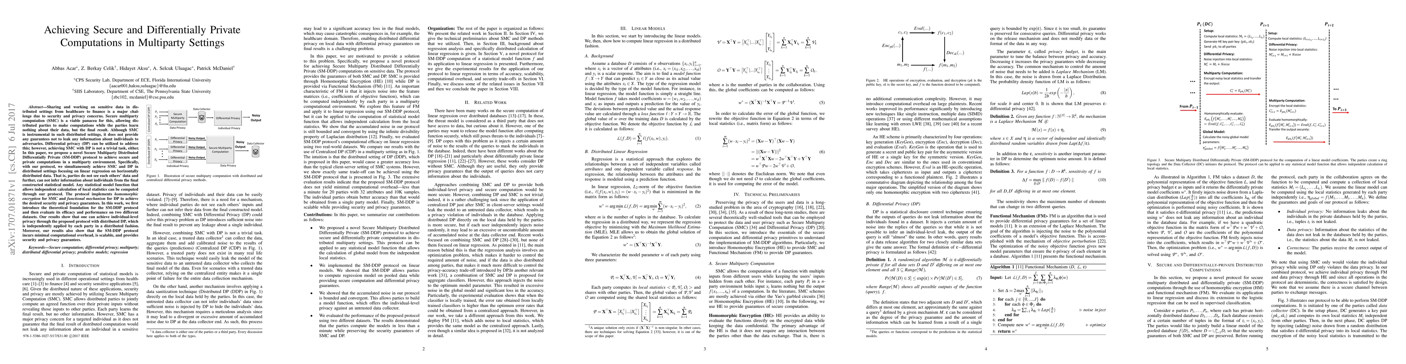 The paper proposes a Secure Multiparty Distributed Differentially Private (SM-DDP) protocol for secure and private computations in multiparty settings, focusing on linear regression with horizontally distributed data. It combines homomorphic encryption (HE) for secure multiparty computation (SMC) and a functional mechanism for differential privacy (DP).