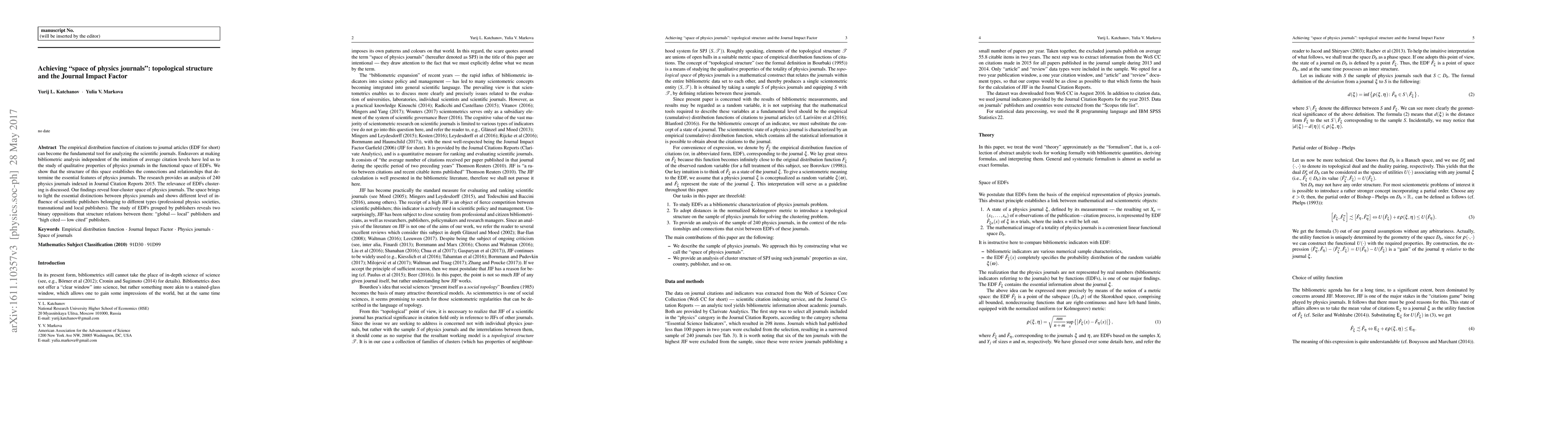 The empirical distribution function of citations to journal articles (EDF for short) can become the fundamental tool for analyzing the scientific journals. Endeavors at making bibliometric analysis independent of the intuition of average citation levels have led us to the study of qualitative properties of physics journals in the functional space of EDFs. We show that the structure of this space establishes the connections and relationships that determine the essential features of physics journals. The research provides an analysis of 240 physics journals indexed in Journal Citation Reports 2015. The relevance of EDFs clustering is discussed. Our findings reveal four-cluster space of physics journals. The space brings to light the essential distinctions between physics journals and shows different level of influence of scientific publishers belonging to different types (professional physics societies, transnational and local publishers). The study of EDFs grouped by publishers reveals two binary oppositions that structure relations between them: "global\,--- local" publishers and "high cited\,--- low cited" publishers.