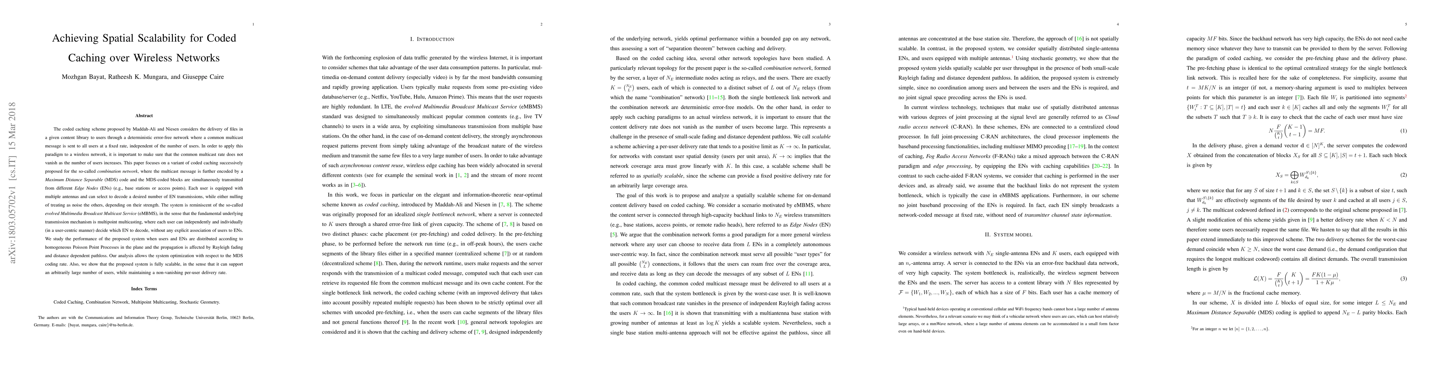 This paper proposes a coded caching system for wireless networks that can support an arbitrarily large number of users while maintaining non-vanishing per-user delivery rates. It uses MDS coding and simultaneous transmission from multiple Edge Nodes to achieve spatial scalability.