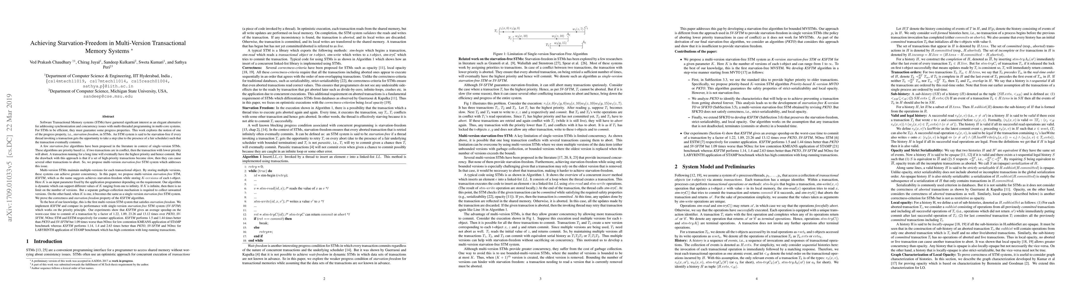 A novel starvation-free algorithm (KSFTM) for multi-version software transactional memory systems, along with its unbounded variant (UVSFTM) with garbage collection.