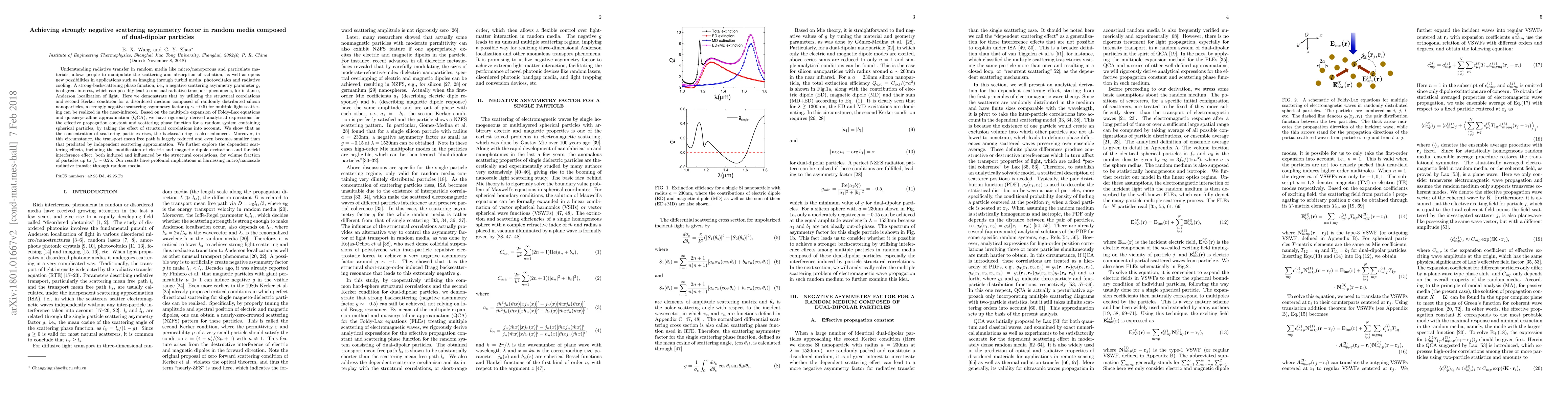 This paper rigorously derives analytical expressions for effective propagation and scattering in random media composed of dual-dipolar particles, demonstrating the realization of a strongly negative scattering asymmetry factor ($g\sim-0.5$) through structural correlations and the second Kerker condition. The findings have significant implications for manipulating radiative transfer in applications like imaging and photovoltaics.