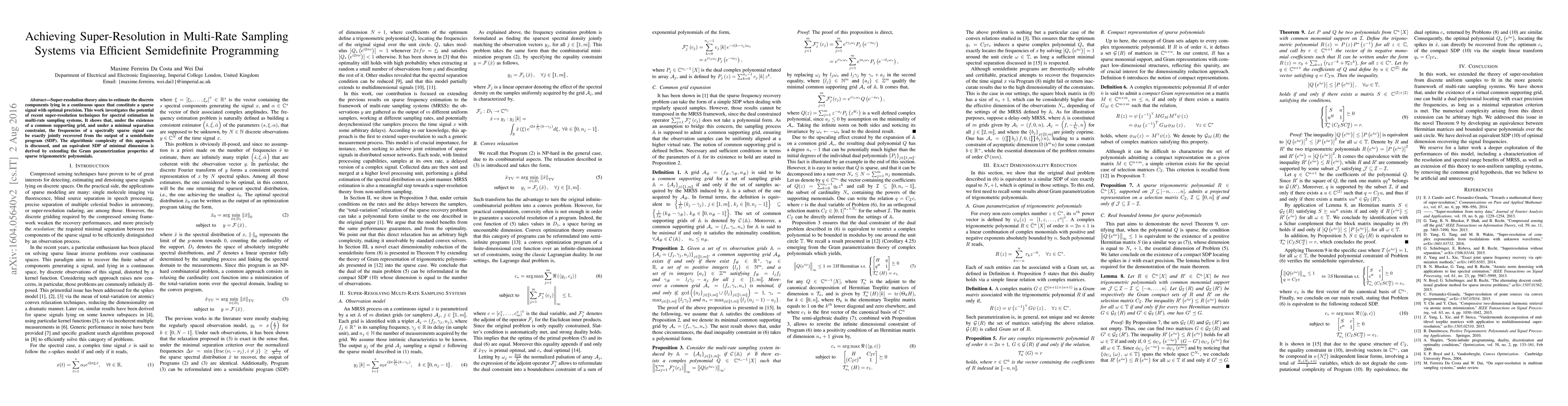 This paper explores super-resolution techniques for spectral estimation in multi-rate sampling systems, demonstrating that frequencies of a sparse signal can be accurately recovered using an efficient semidefinite programming approach. An equivalent minimal-dimension SDP is derived, leveraging Gram parametrization properties for optimal precision.