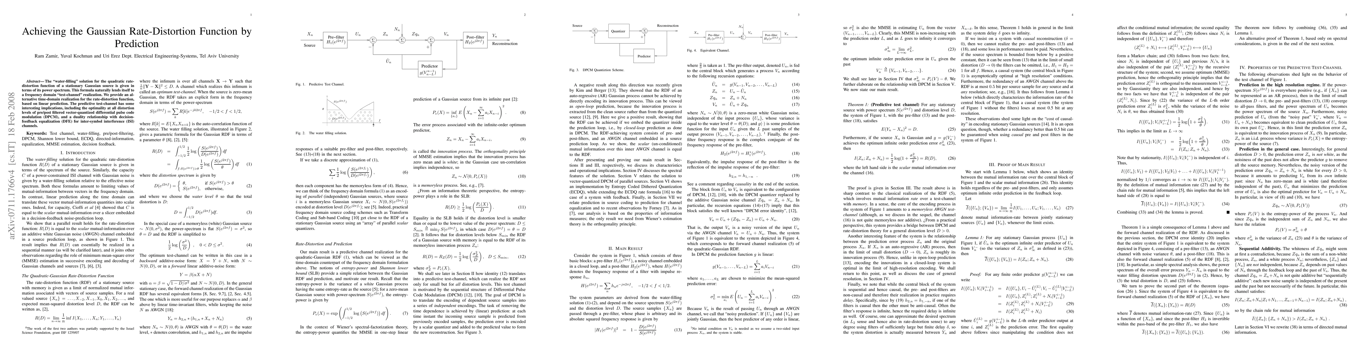 The paper introduces a time-domain realization for the Gaussian rate-distortion function via linear prediction, demonstrating its equivalence to the classical water-filling solution and establishing a duality with DFE.