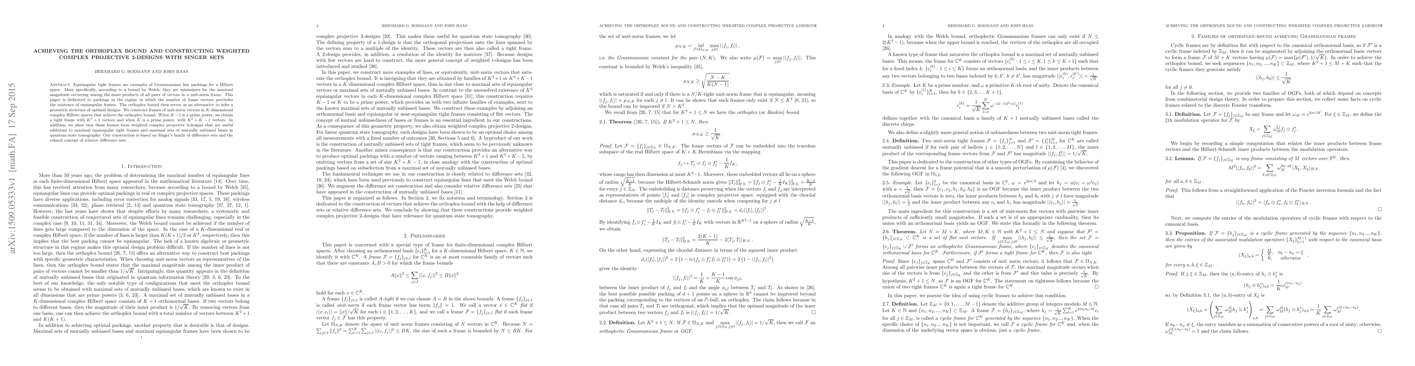 This paper constructs optimal packings of unit-norm vectors in complex Hilbert spaces that achieve the orthoplex bound, using Singer sets. It presents tight frames with specific vector counts and demonstrates their utility as weighted complex projective 2-designs in quantum state tomography.
