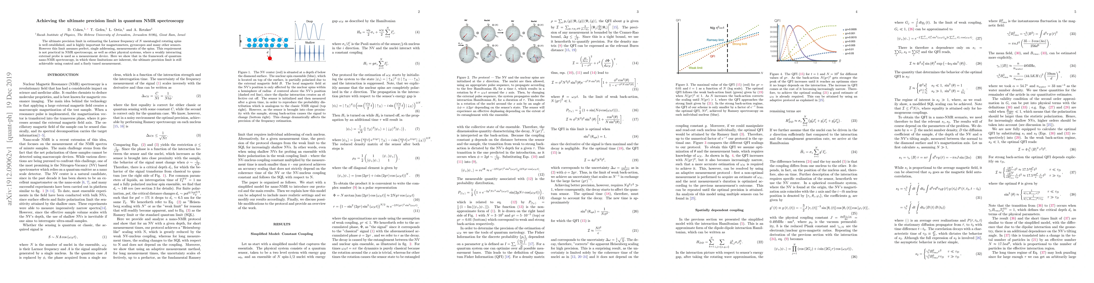 This paper demonstrates that quantum nano-NMR spectroscopy can achieve the ultimate precision limit for estimating the Larmor frequency of unentangled spins, despite practical limitations such as weakly interacting external probes, through the use of control and finely tuned measurement techniques.