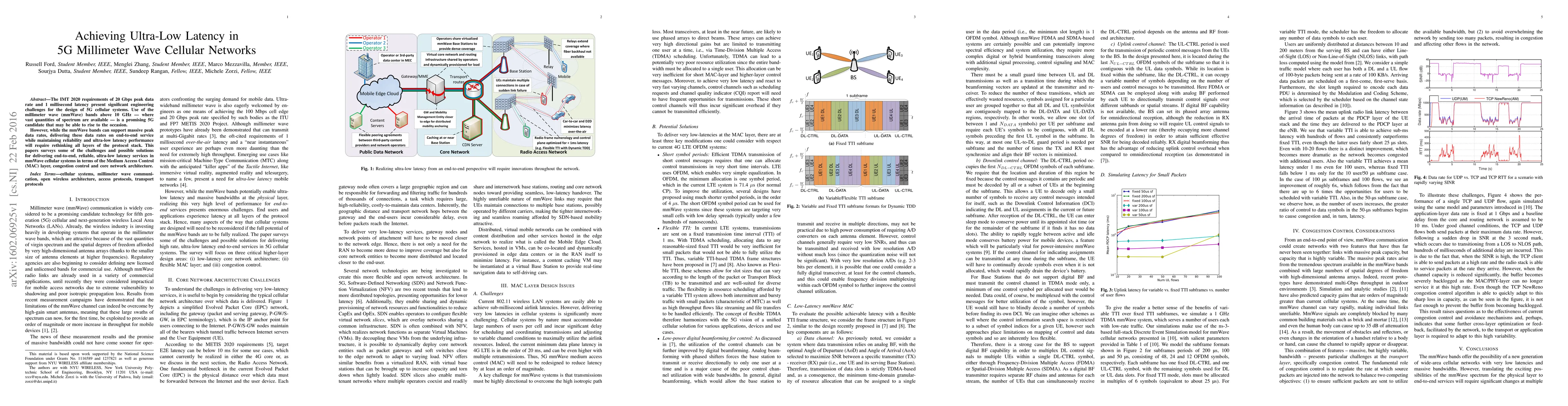 This paper discusses the engineering challenges and potential solutions for achieving ultra-low latency in 5G cellular networks using millimeter wave bands, focusing on protocol stack layers like MAC, congestion control, and core network architecture. It surveys how these aspects can support the required 20 Gbps data rates and 1 ms latency for IMT 2020.