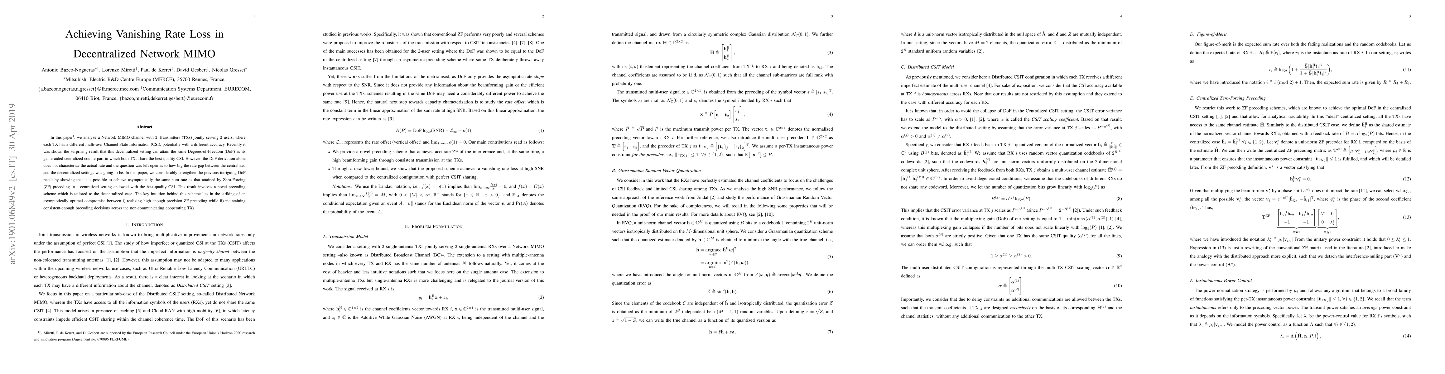 Researchers have developed a novel precoding scheme that enables decentralized network MIMO to achieve asymptotically the same sum rate as centralized Zero-Forcing precoding with high-quality CSI.