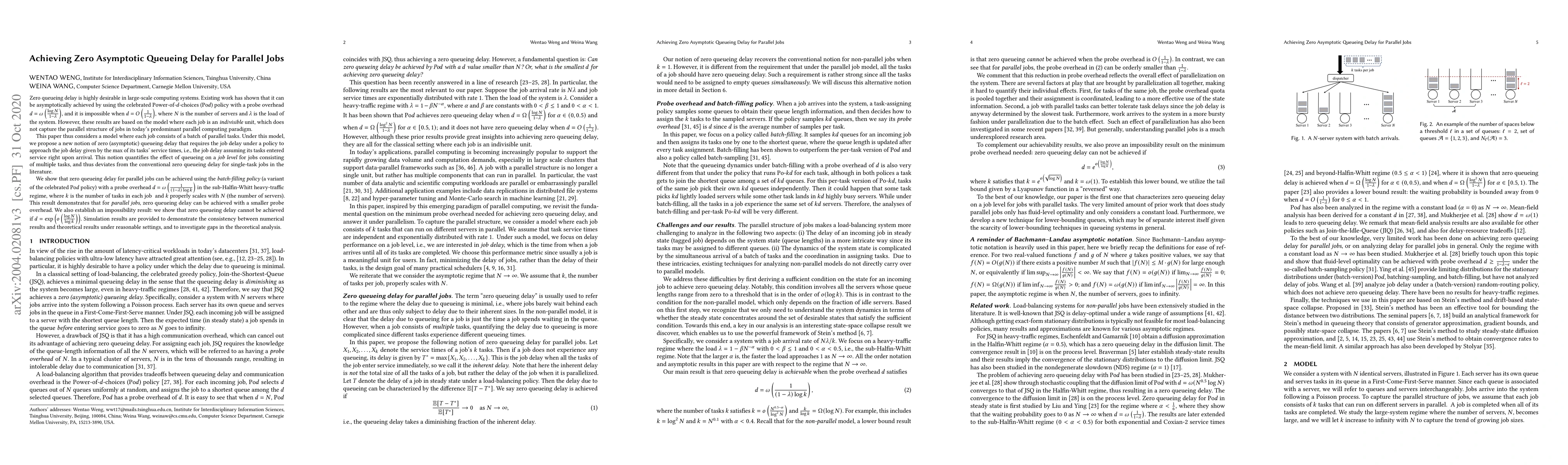 This paper proposes a new notion of zero (asymptotic) queueing delay for parallel jobs, showing that it can be achieved using a batch-filling policy with a smaller probe overhead compared to single-task jobs. An impossibility result is also established, demonstrating that certain probe overheads cannot achieve this delay for parallel jobs.