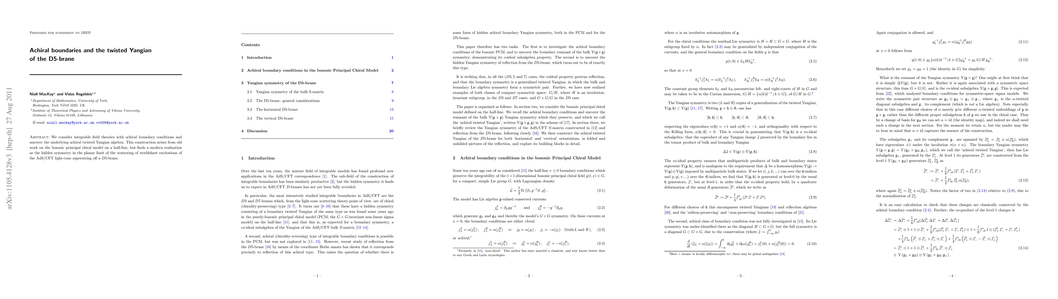 We consider integrable field theories with achiral boundary conditions and uncover the underlying achiral twisted Yangian algebra. This construction arises from old work on the bosonic principal chiral model on a half-line, but finds a modern realization as the hidden symmetry in the planar limit of the scattering of worldsheet excitations of the AdS/CFT light-cone superstring off a D5-brane.