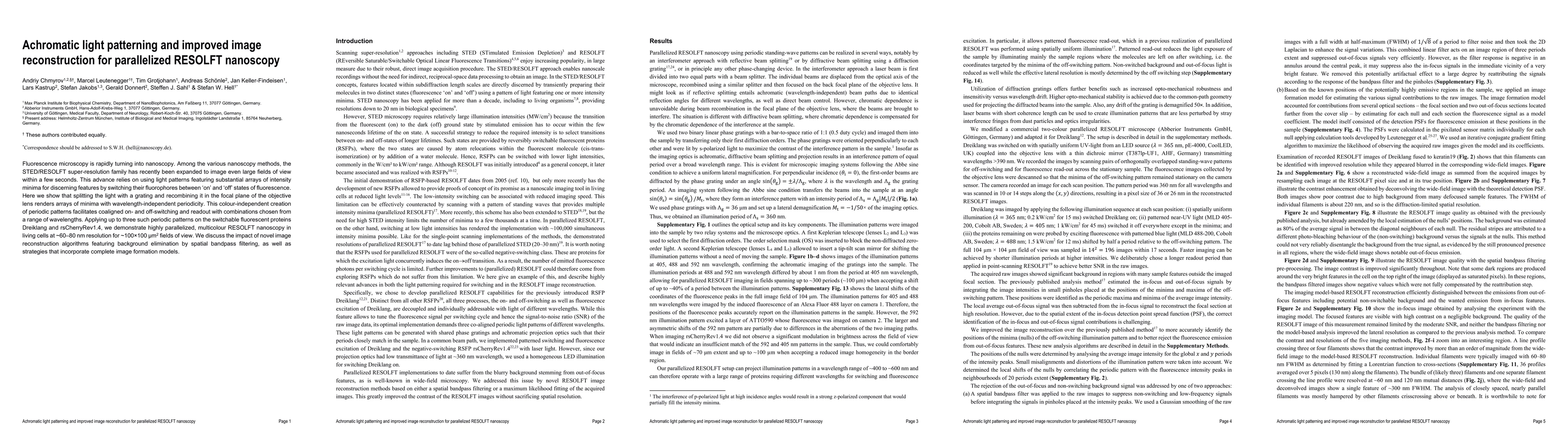 Fluorescence microscopy is rapidly turning into nanoscopy. Among the various nanoscopy methods, the STED/RESOLFT super-resolution family has recently been expanded to image even large fields of view within a few seconds. This advance relies on using light patterns featuring substantial arrays of intensity minima for discerning features by switching their fluorophores between on and off states of fluorescence. Here we show that splitting the light with a grating and recombining it in the focal plane of the objective lens renders arrays of minima with wavelength-independent periodicity. This colour-independent creation of periodic patterns facilitates coaligned on- and off-switching and readout with combinations chosen from a range of wavelengths. Applying up to three such periodic patterns on the switchable fluorescent proteins Dreiklang and rsCherryRev1.4, we demonstrate highly parallelized, multicolour RESOLFT nanoscopy in living cells at 60-80 nm resolution for 100 times 100 square micrometers fields of view. We discuss the impact of novel image reconstruction algorithms featuring background elimination by spatial bandpass filtering, as well as strategies that incorporate complete image formation models.