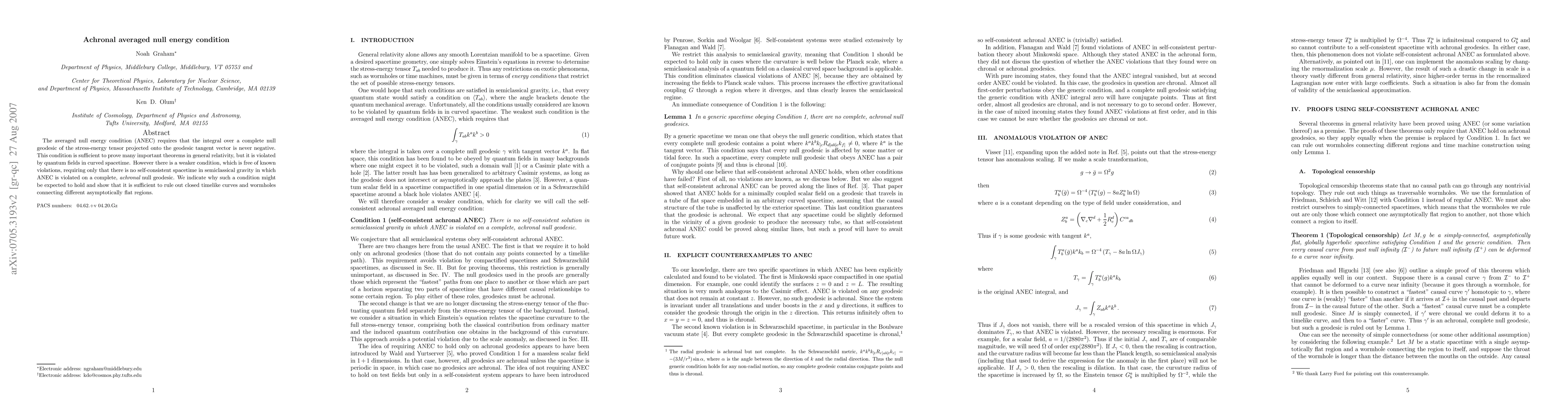 The achronal averaged null energy condition (ANEC) ensures no self-consistent spacetime where ANEC is violated on achronal null geodesics, ruling out wormholes and closed timelike curves. This weaker condition avoids known violations by quantum fields in curved spacetime.