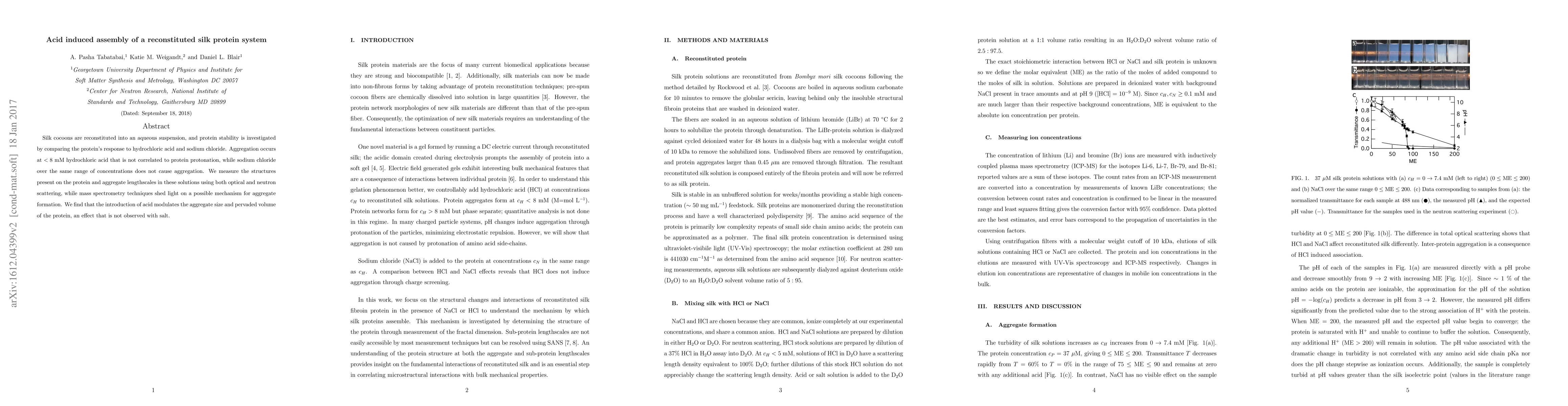 Acidic conditions cause silk protein assembly to form aggregates in concentrations as low as 8 mM hydrochloric acid, but not with sodium chloride; mass spectrometry suggests a possible mechanism for aggregate formation.