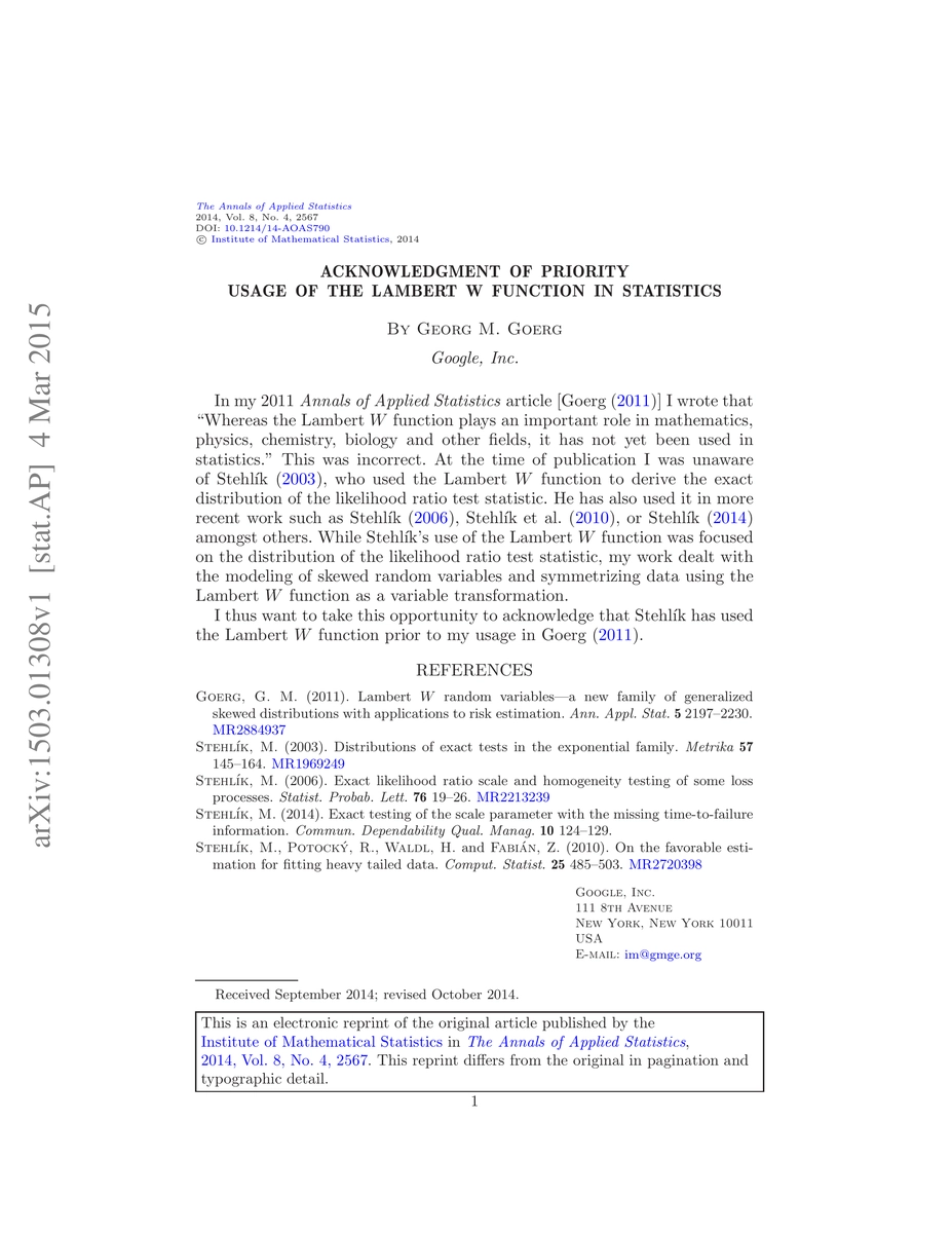 In my 2011 Annals of Applied Statistics article [Goerg (2011)] I wrote that "Whereas the Lambert $W$ function plays an important role in mathematics, physics, chemistry, biology and other fields, it has not yet been used in statistics." This was incorrect. At the time of publication I was unaware of Stehl\'{\i}k (2003), who used the Lambert $W$ function to derive the exact distribution of the likelihood ratio test statistic. He has also used it in more recent work such as Stehl\'{\i}k (2006), Stehl\'{\i}k et al. (2010), or Stehl\'{\i}k (2014) amongst others. While Stehl\'{i}k's use of the Lambert $W$ function was focused on the distribution of the likelihood ratio test statistic, my work dealt with the modeling of skewed random variables and symmetrizing data using the Lambert $W$ function as a variable transformation.