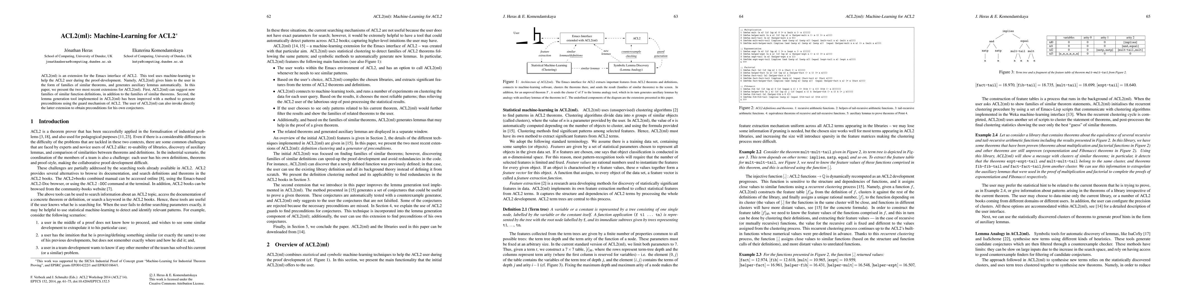 ACL2(ml) enhances the ACL2 theorem prover by incorporating machine learning to provide users with hints and automatically generate auxiliary lemmas. Recent updates include suggesting families of similar function definitions and improving the lemma generation tool to create preconditions using ACL2's guard mechanism.