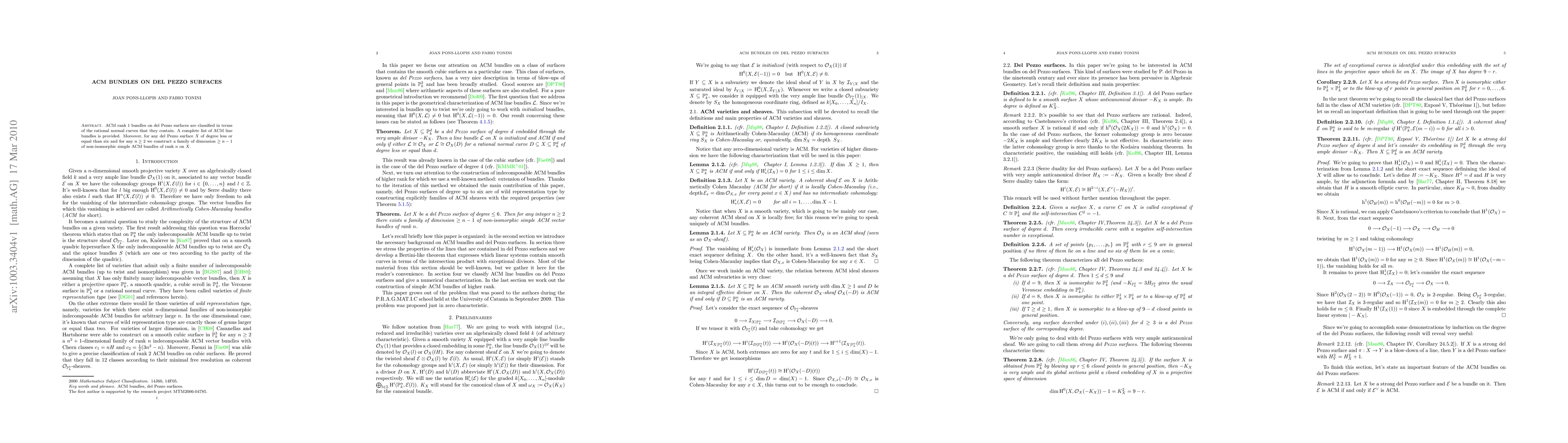 The research classifies ACM rank 1 bundles on del Pezzo surfaces using rational normal curves and provides a complete list of ACM line bundles. It constructs families of simple ACM bundles of rank n on del Pezzo surfaces of degree ≤ 6 for any n ≥ 2, ensuring dimension ≥ n - 1.