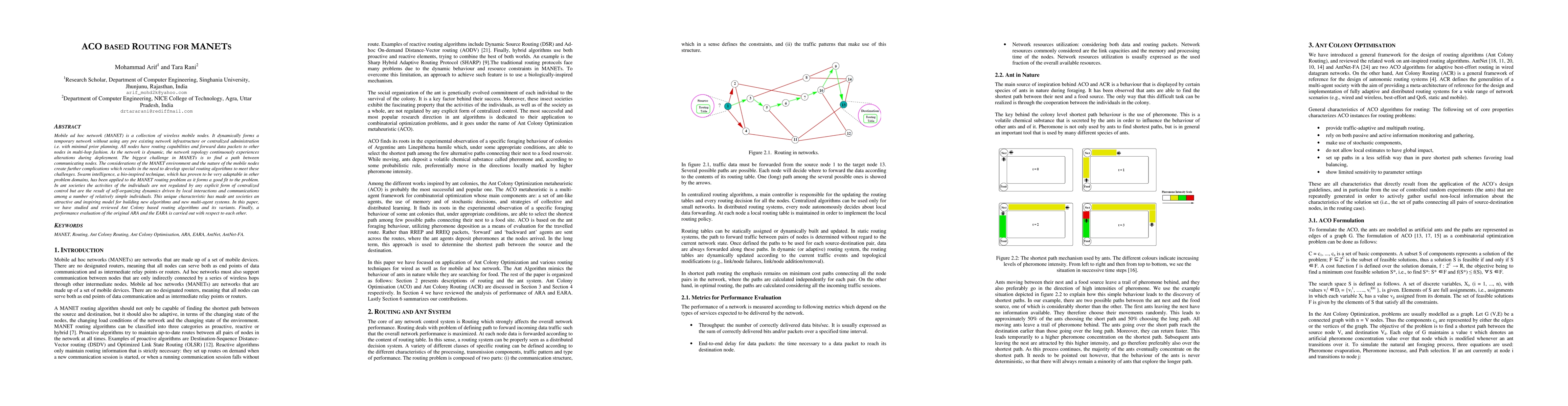 This paper explores Ant Colony Optimization (ACO) based routing algorithms for Mobile Ad Hoc Networks (MANETs), reviewing their variants and evaluating the performance of the original Ant Routing Algorithm (ARA) and Enhanced Ant Routing Algorithm (EARA) in dynamic network environments.