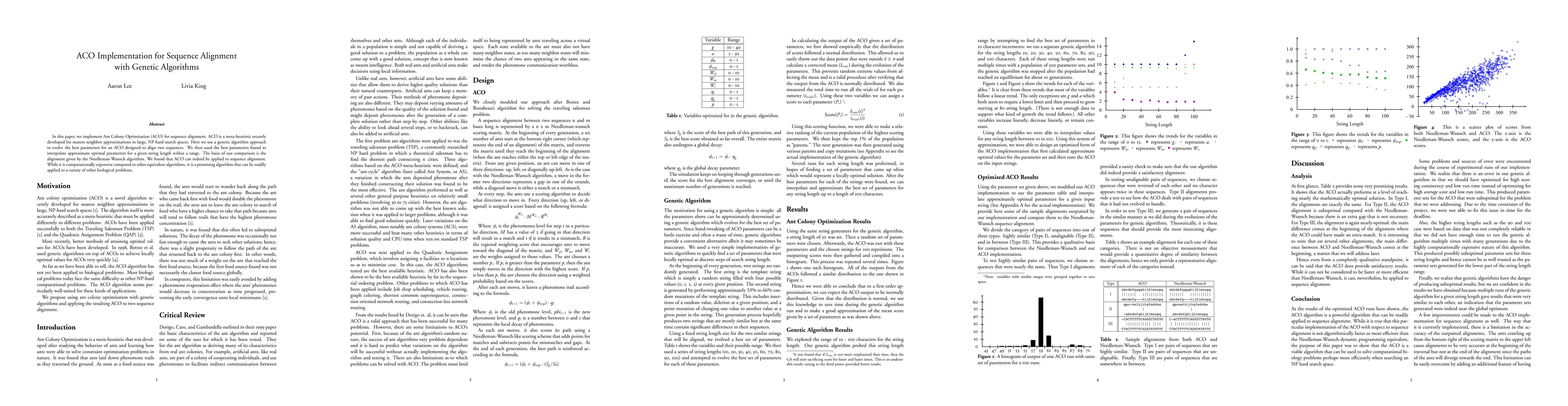 In this paper, we implement Ant Colony Optimization (ACO) for sequence alignment. ACO is a meta-heuristic recently developed for nearest neighbor approximations in large, NP-hard search spaces. Here we use a genetic algorithm approach to evolve the best parameters for an ACO designed to align two sequences. We then used the best parameters found to interpolate approximate optimal parameters for a given string length within a range. The basis of our comparison is the alignment given by the Needleman-Wunsch algorithm. We found that ACO can indeed be applied to sequence alignment. While it is computationally expensive compared to other equivalent algorithms, it is a promising algorithm that can be readily applied to a variety of other biological problems.