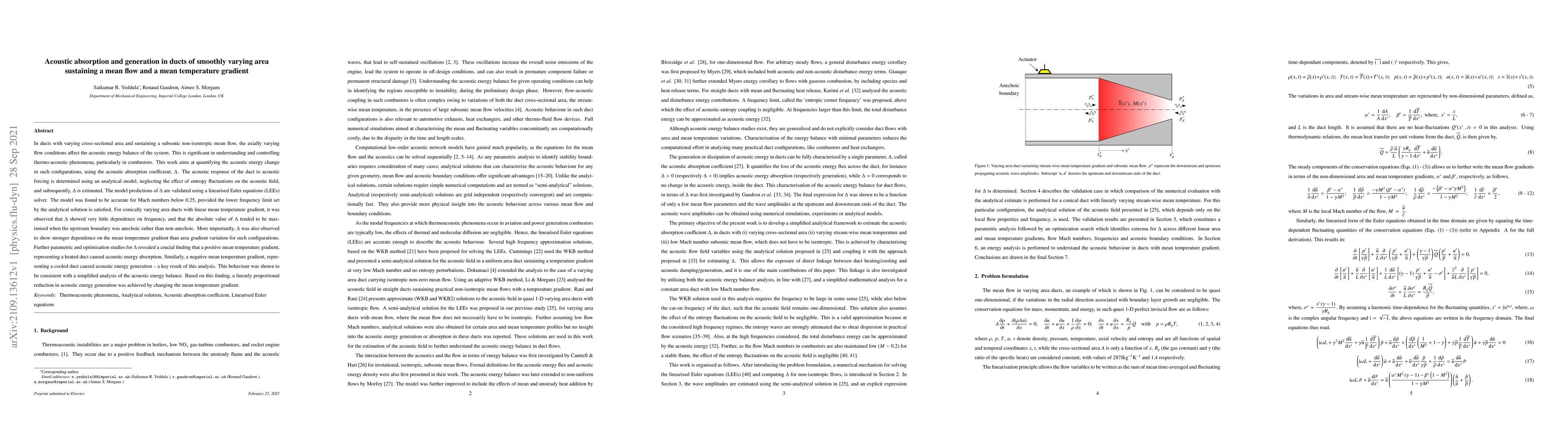 This paper quantifies acoustic energy change in ducts with varying cross-sectional area and subsonic non-isentropic flow, finding that a positive mean temperature gradient enhances acoustic absorption while a negative gradient promotes acoustic energy generation. The analytical model's predictions, validated by a LEEs solver, show accuracy for Mach numbers below 0.25.