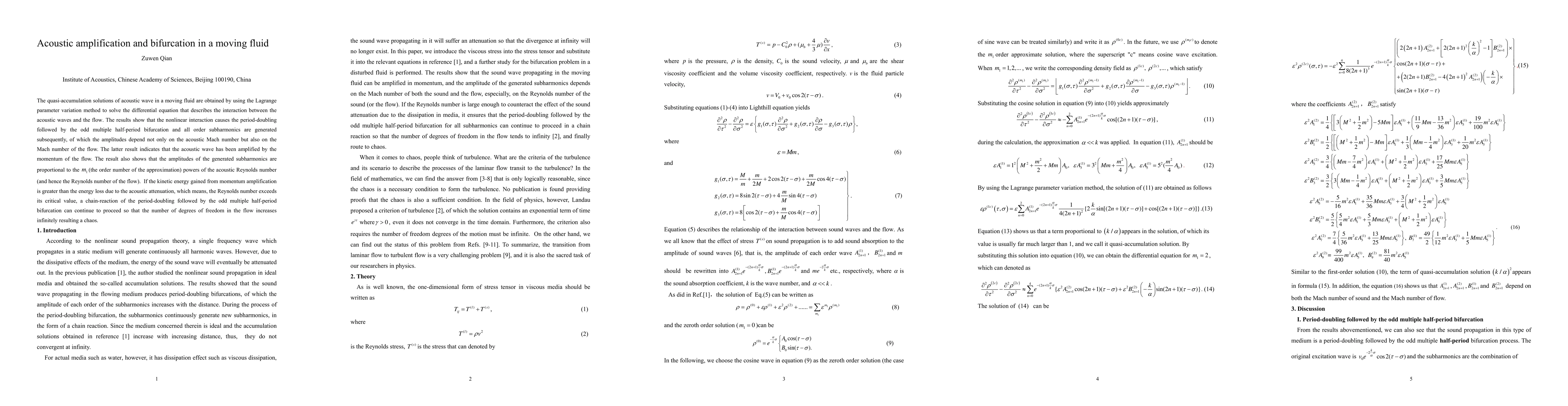 The quasi-accumulation solutions of acoustic wave in a moving fluid are obtained by using the Lagrange parameter variation method to solve the differential equation that describes the interaction between the acoustic waves and the flow. The results show that the nonlinear interaction causes the period-doubling followed by the odd multiple half-period bifurcation and all order subharmonics are generated subsequently, of which the amplitudes depend not only on the acoustic Mach number but also on the Mach number of the flow. The latter result indicates that the acoustic wave has been amplified by the momentum of the flow. The result also shows that the amplitudes of the generated subharmonics are proportional to the (the order number of the approximation) powers of the acoustic Reynolds number (and hence the Reynolds number of the flow). If the kinetic energy gained from momentum amplification is greater than the energy loss due to the acoustic attenuation, which means, the Reynolds number exceeds its critical value, a chain-reaction of the period-doubling followed by the odd multiple half-period bifurcation can continue to proceed so that the number of degrees of freedom in the flow increases infinitely resulting a chaos.