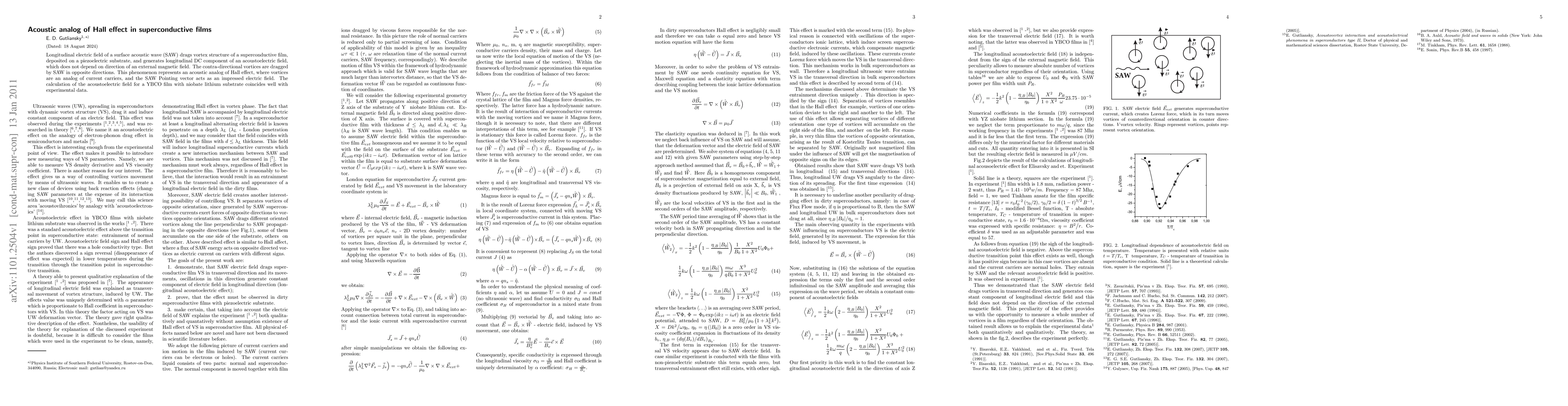 Longitudinal electric field of a surface acoustic wave (SAW) drags vortex structure of a superconductive film, deposited on a piezoelectric substrate, and generates longitudinal DC component of an acoustoelectric field, which does not depend on direction of an external magnetic field. The contra-directional vortices are dragged by SAW in opposite directions. This phenomenon represents an acoustic analog of Hall effect, where vortices are an analog of current carriers, and the SAW Pointing vector acts as an impressed electric field. The calculation of the acoustoelectric field for a YBCO film with niobate lithium substrate coincides well with experimental data.