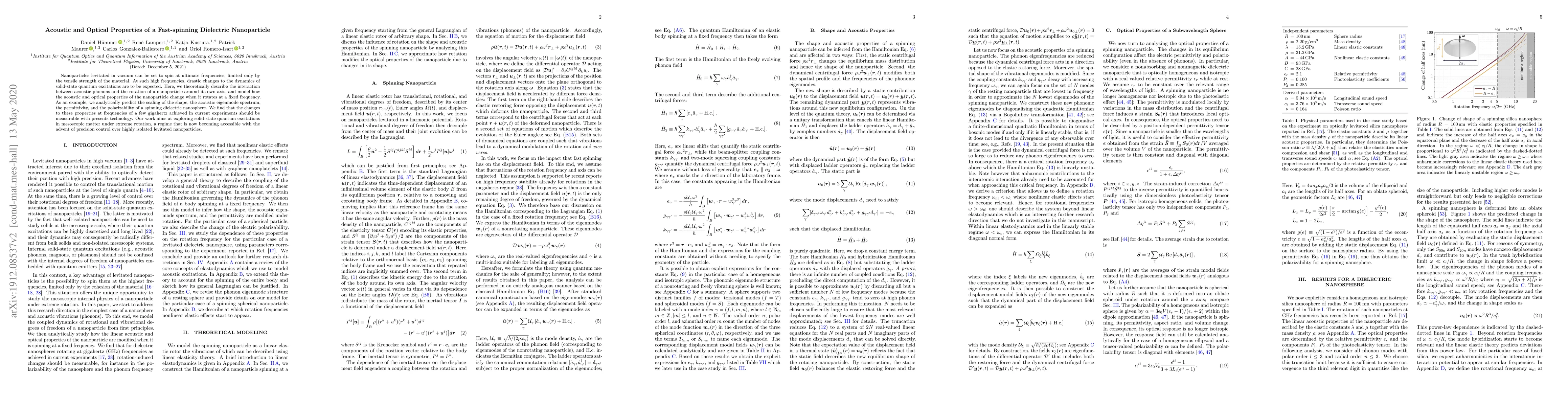 The paper presents a general theory for the interaction between rotational degrees of freedom and acoustic internal phonons of a nanoparticle with linear elastic dynamics, modeling how its shape, phonon spectrum, permittivity, and electric polarizability change with rotation.