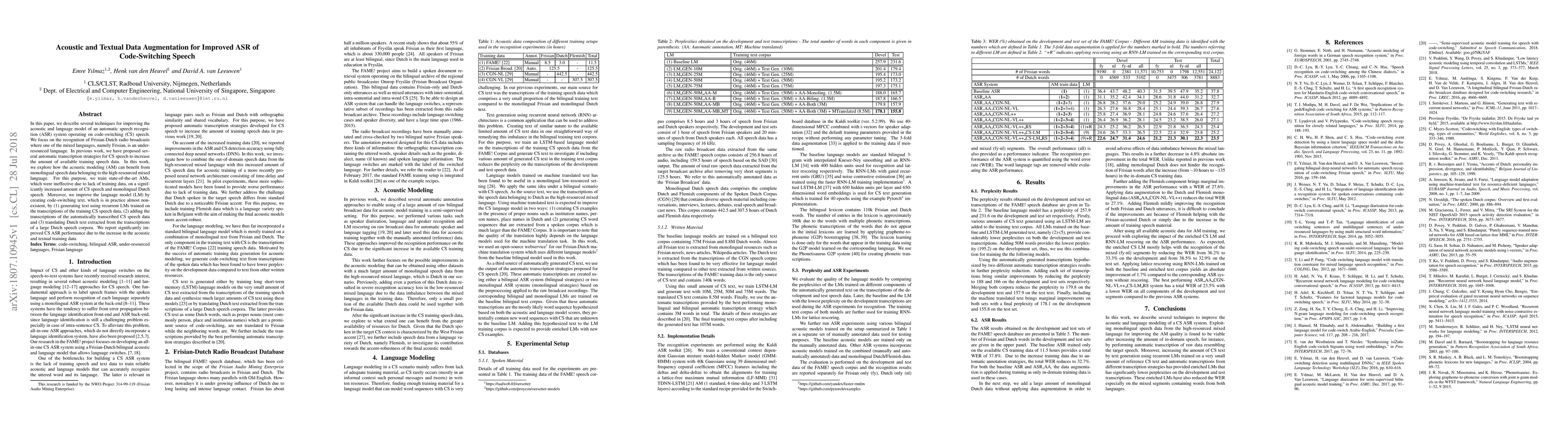 In this paper, we describe several techniques for improving the acoustic and language model of an automatic speech recognition (ASR) system operating on code-switching (CS) speech. We focus on the recognition of Frisian-Dutch radio broadcasts where one of the mixed languages, namely Frisian, is an under-resourced language. In previous work, we have proposed several automatic transcription strategies for CS speech to increase the amount of available training speech data. In this work, we explore how the acoustic modeling (AM) can benefit from monolingual speech data belonging to the high-resourced mixed language. For this purpose, we train state-of-the-art AMs, which were ineffective due to lack of training data, on a significantly increased amount of CS speech and monolingual Dutch speech. Moreover, we improve the language model (LM) by creating code-switching text, which is in practice almost non-existent, by (1) generating text using recurrent LMs trained on the transcriptions of the training CS speech data, (2) adding the transcriptions of the automatically transcribed CS speech data and (3) translating Dutch text extracted from the transcriptions of a large Dutch speech corpora. We report significantly improved CS ASR performance due to the increase in the acoustic and textual training data.
