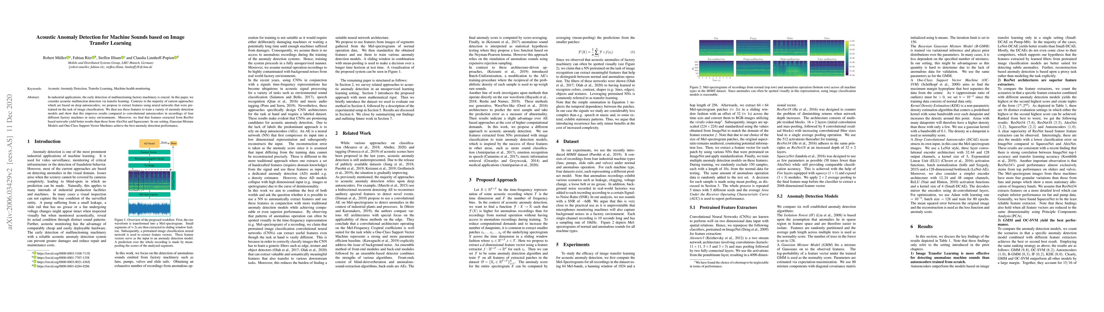 In industrial applications, the early detection of malfunctioning factory machinery is crucial. In this paper, we consider acoustic malfunction detection via transfer learning. Contrary to the majority of current approaches which are based on deep autoencoders, we propose to extract features using neural networks that were pretrained on the task of image classification. We then use these features to train a variety of anomaly detection models and show that this improves results compared to convolutional autoencoders in recordings of four different factory machines in noisy environments. Moreover, we find that features extracted from ResNet based networks yield better results than those from AlexNet and Squeezenet. In our setting, Gaussian Mixture Models and One-Class Support Vector Machines achieve the best anomaly detection performance.