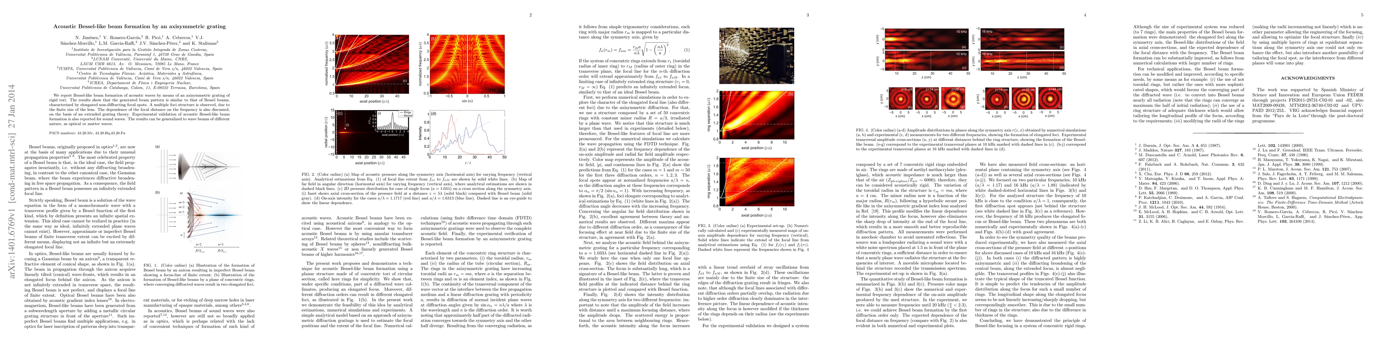 This research demonstrates the generation of acoustic Bessel-like beams using an axisymmetric grating composed of rigid tori, exhibiting elongated, non-diffracting focal spots. The study also explores the dependence of focal distance on frequency and validates the formation experimentally for sound waves, with potential applicability to other wave types like optical and matter waves.