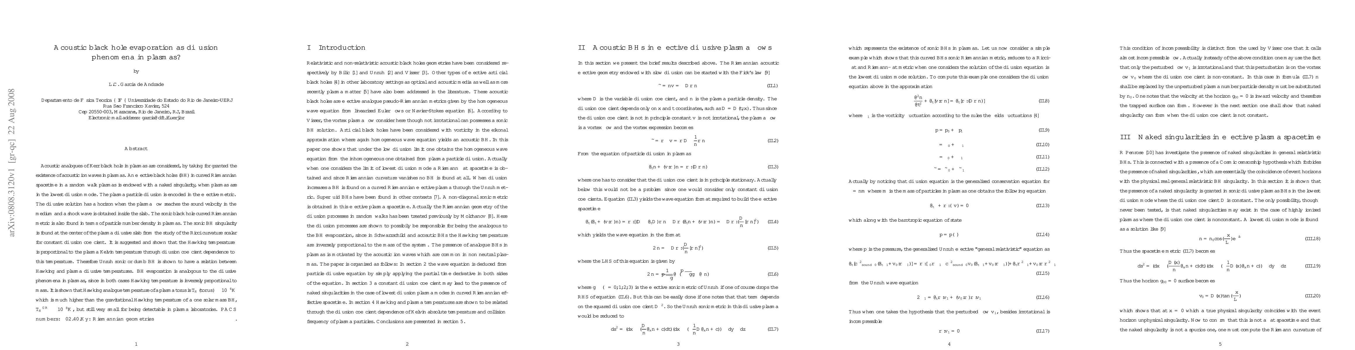 Acoustic analogues of Kerr black hole in plasmas are considered, by taking for granted the existence of acoustic ion waves in plasmas. An effective black holes (BH) in curved Riemannian spacetime in a random walk plasmas is endowed with a naked singularity, when plasmas are in the lowest diffusion mode. The plasma particle diffusion is encoded in the effective metric. The diffusive solution has a horizon when the plasma flow reaches the sound velocity in the medium and a shock wave is obtained inside the slab. The sonic black hole curved Riemannian metric is also found in terms of particle number density in plasmas. The sonic BH singularity is found at the center of the plasma diffusive slab from the study of the Ricci curvature scalar for constant diffusion coefficient. It is suggested and shown that the Hawking temperature is proportional to the plasma Kelvin temperature through diffusion coefficient dependence to this temperature. Therefore Unruh sonic or dumb BH is shown to have a relation between Hawking and plasma diffusive temperatures. BH evaporation is analogous to the diffusive phenomena in plasmas, since in both cases Hawking temperature is inversely proportional to mass. It is shown that Hawking analogue temperature of a plasma torus is $T_{H}(torus)\approx{10^{-4}K}$ which is much higher than the gravitational Hawking temperature of a one solar mass BH, ${T_{H}}^{GR}\approx{10^{-8}K}$, but still very small for being detectable in plasma laboratories.