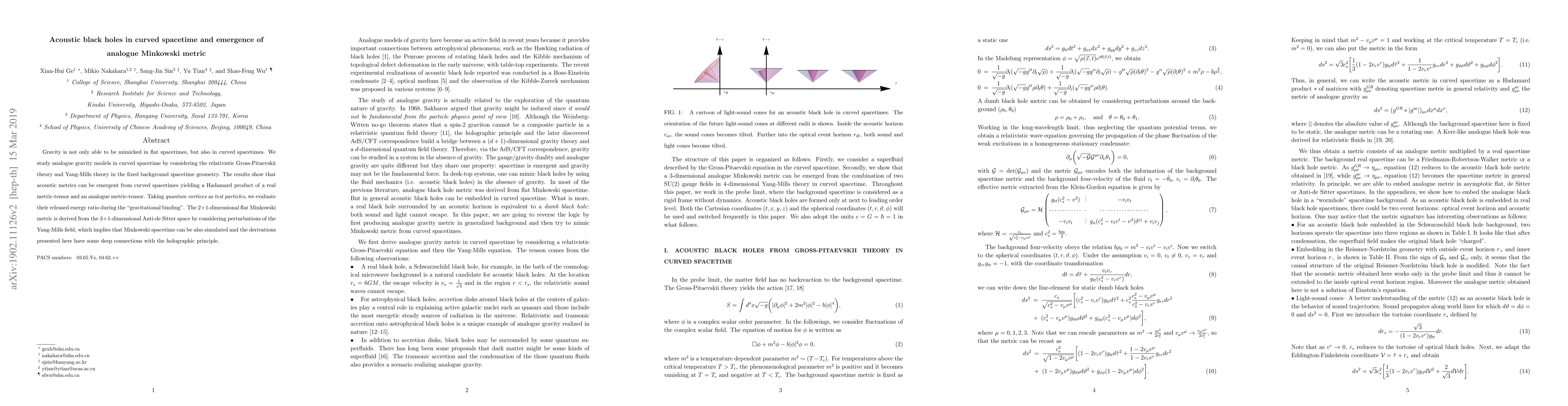 This research demonstrates that gravity can be simulated not just in flat, but also curved spacetimes using analogue gravity models. By employing relativistic Gross-Pitaevskii and Yang-Mills theories, the study reveals that acoustic metrics can emerge from curved spacetimes, leading to a form of Minkowski metric. This finding suggests that Minkowski spacetime can be emulated and has implications connecting to the holographic principle.