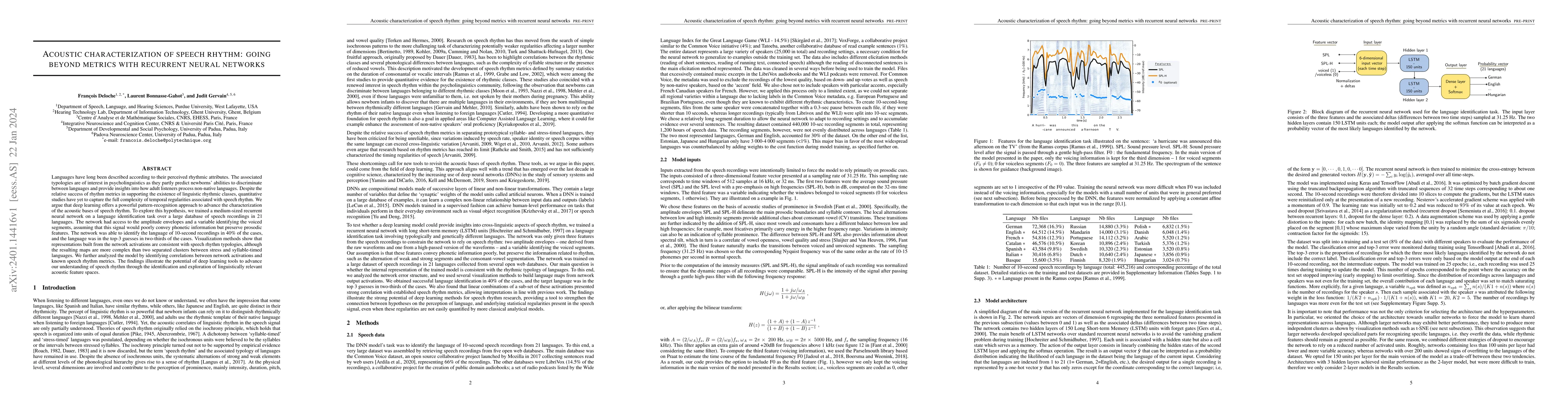 This paper explores the use of recurrent neural networks to characterize speech rhythm beyond traditional metrics, demonstrating that deep learning can identify complex temporal regularities in speech rhythm. The trained network achieved notable language identification accuracy, revealing more nuanced representations of speech rhythm than existing typologies.