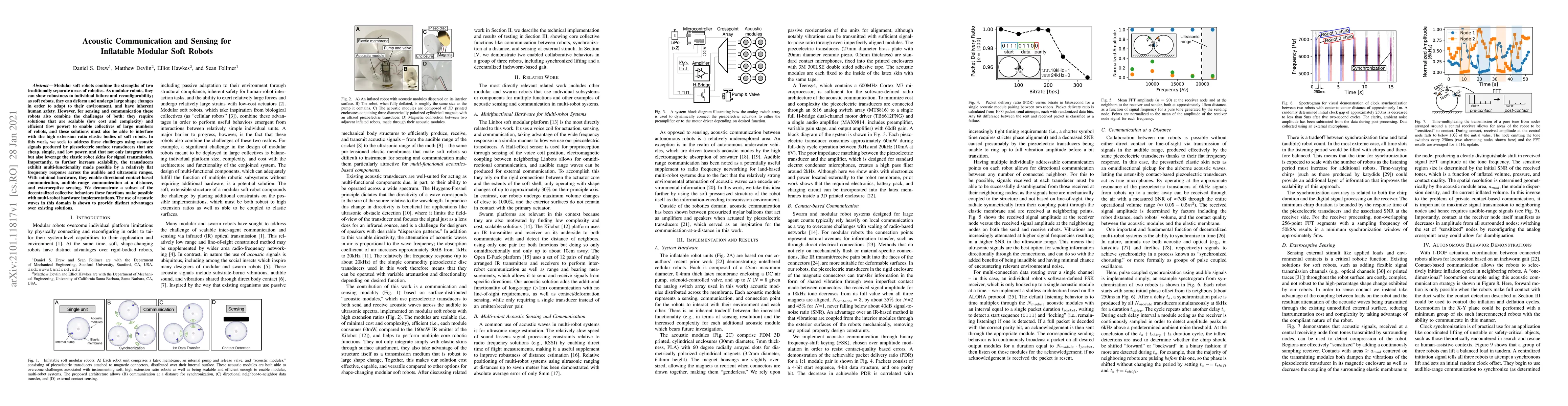 This paper explores the use of acoustic signals from piezoelectric transducers for communication and sensing in inflatable modular soft robots, addressing scalability, efficiency, and integration challenges. The proposed acoustic approach enables directional contact-based communication, long-range audible communication, and exteroceptive sensing, demonstrating enhanced collective behaviors in multi-robot systems.